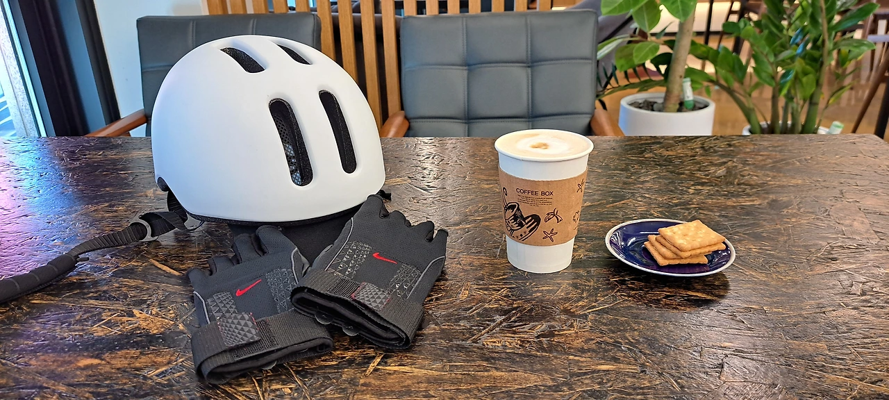 생활 자전거와 헬스 장갑, 헬멧 그리고 커피