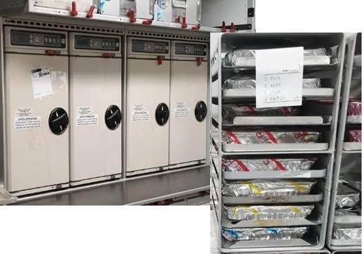 세 번째는 기내식의 메인 메뉴인 'Casserole'을 데우는 오븐입니다. Casserole을 실어 나르는 '오븐 랙'(Oven rack) 안에는 각 포일의 색 별로 Beef/ Seafood/ Chicken 등 열어 보지 않아도 안전하게 안에 들어있는 메뉴가 무엇인지를 단번에 알려줍니다. 세팅된 오븐 랙 그대로 오븐에 넣어 기내식의 준비를 냄새로 알리며 '맛있는 쿠킹'을 시작합니다.