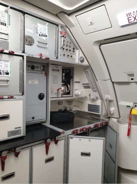 이 곳에는 말 그대로 정말 다양한 세부 물품이 보관되어 있는데요. 예를 들면 일회용 귀마개부터 여분의 음료, 약품류, 화장실 물품 등 카운트가 불가할 정도의 종류입니다. 여행을 마칠 때까지 기내에서 큰 불편함 없이 생활할 수 있도록 승무원과 승객들의 필요 물품들을 여기에 담아 항공기에 싣습니다. 그리고 사용 전, 후는 항상 안전하게 빨간색 'Latch'를 채워 단단히 고정해두죠. 비행 거리에 따라 항공기 기종에 따라 기내에 총 수십 개의 수량이 실리게 됩니다.
