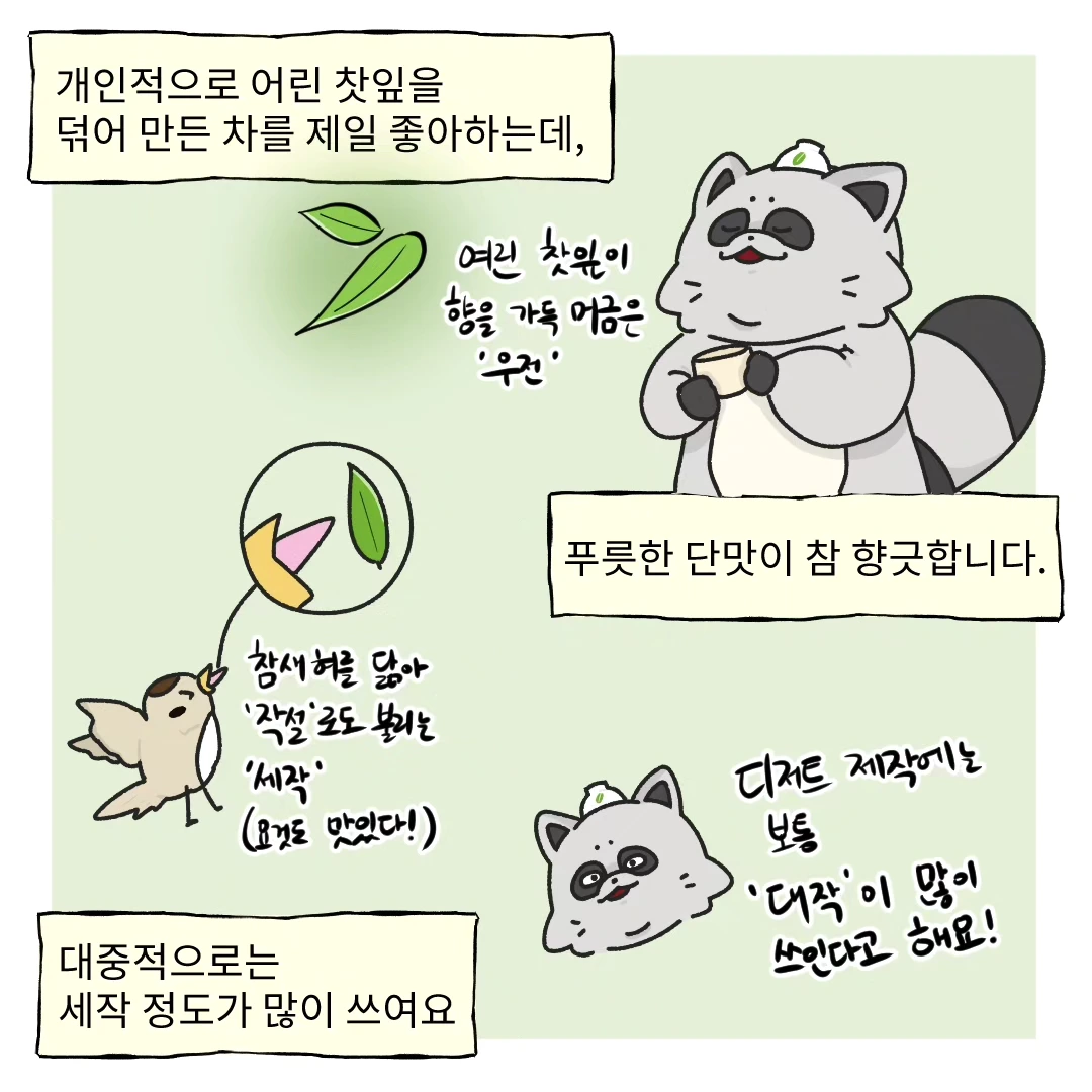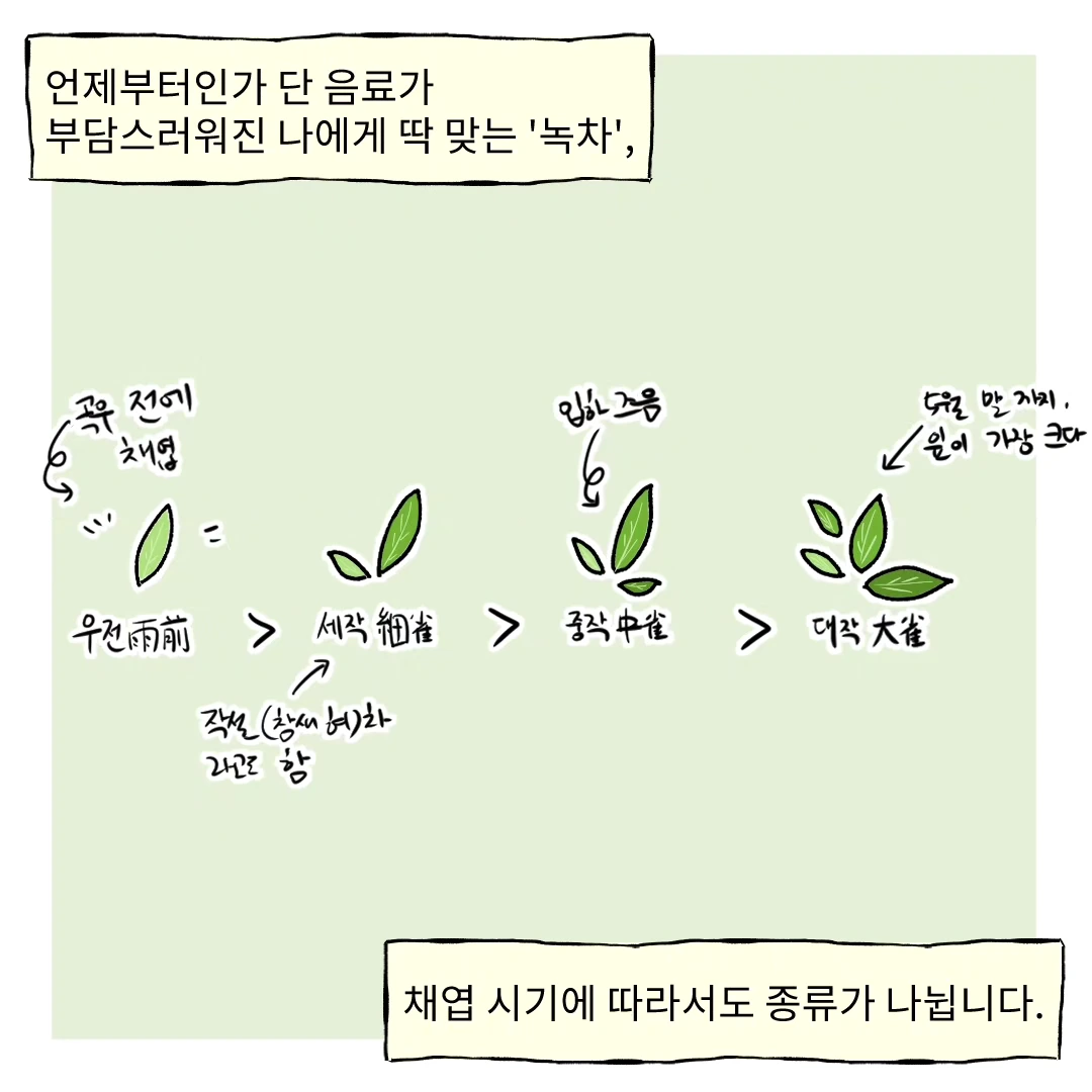 아마 살면서 녹차 안 먹어 본 사람은 없을 것 같네요, 그만큼이나 주위에서 흔히 접할 수 있는 차 중 하나입니다. 우전, 세작(작설), 중작, 대작 등 채엽 시기에 따라 다른 이름이 붙으며, 맛도 조금씩 달라져요.