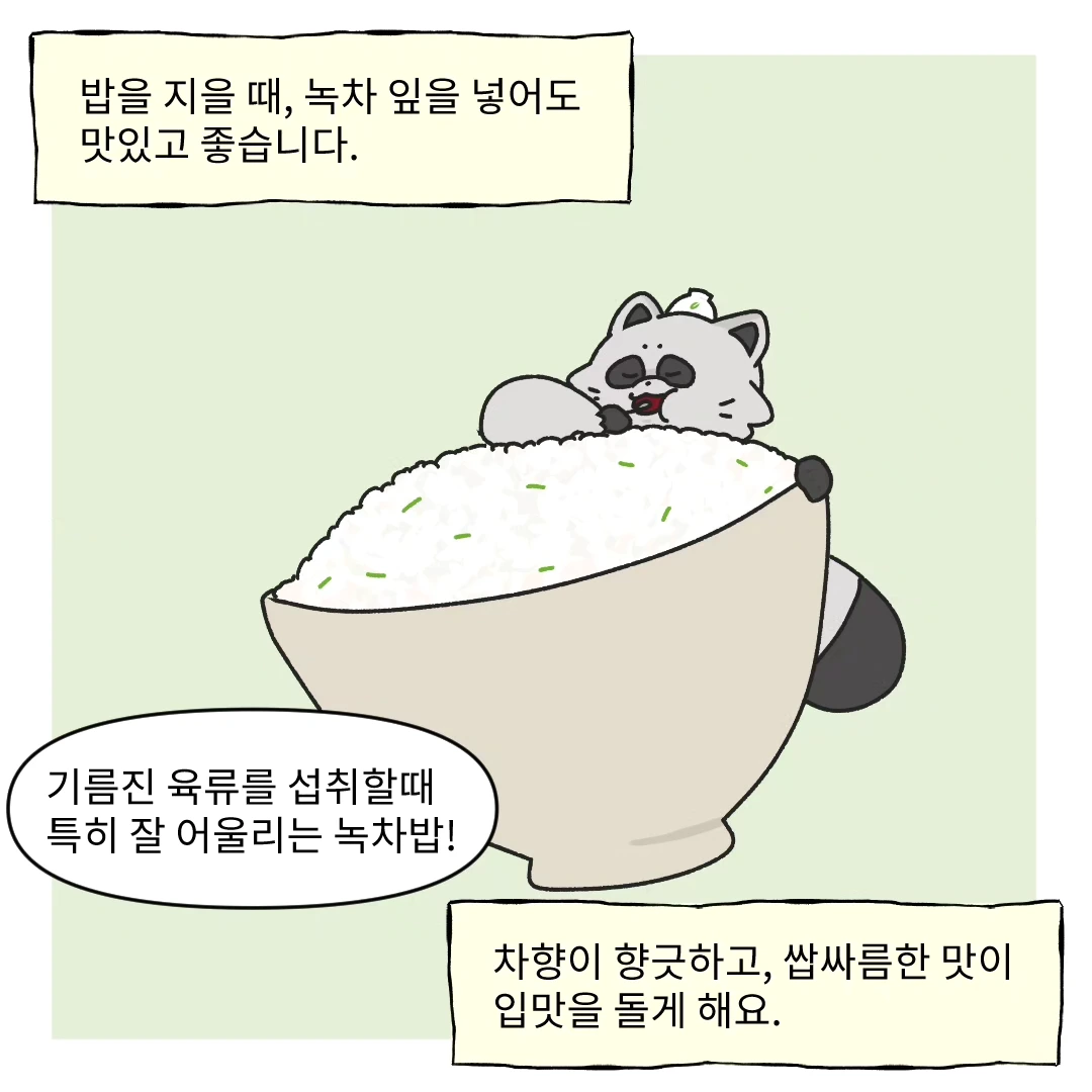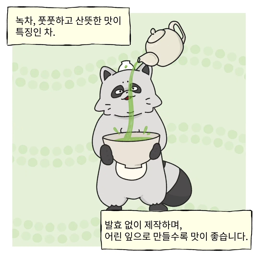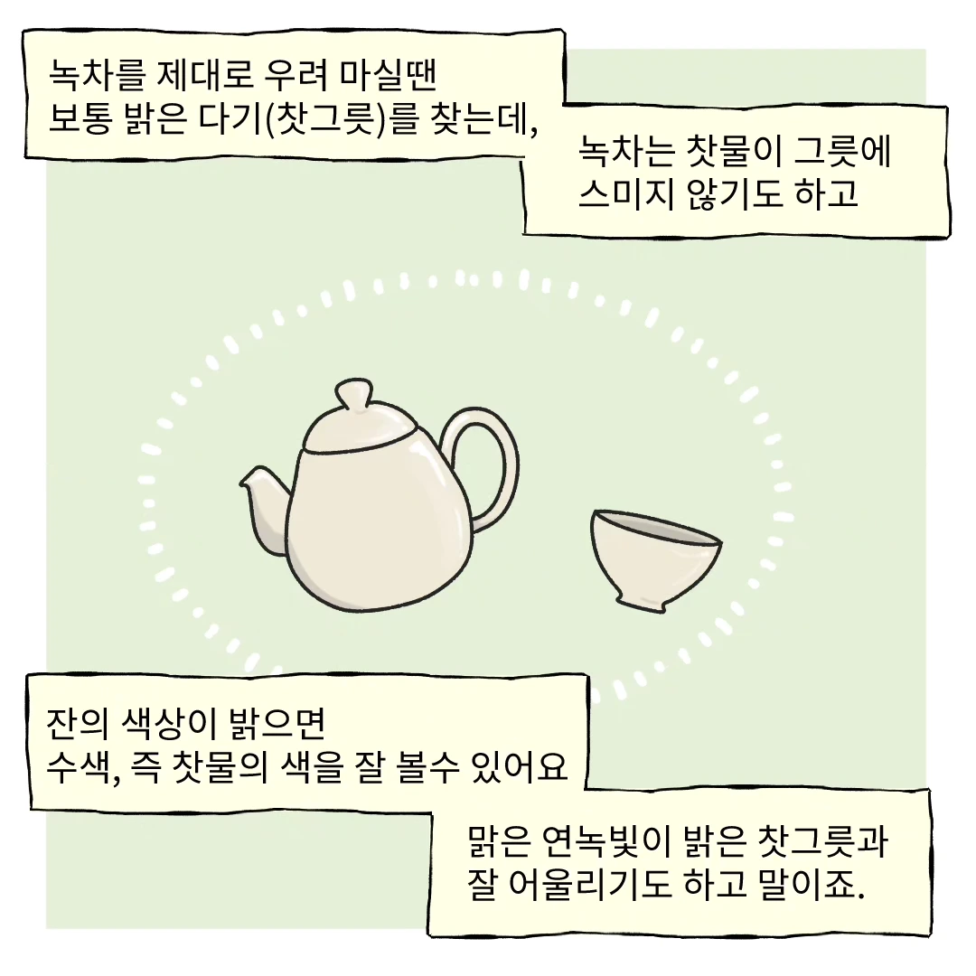 오늘은 6대 다류 중 녹차에 대해 그려보았습니다. 산뜻한 어린 맛이 특징인 녹차는 기름기 제거와 불쾌한 냄새 제거에도 탁월해요. 그래서 구강 건강에도 좋은 차랍니다! 미백 효과까지 있으니 더할 나위 없이 좋지요.