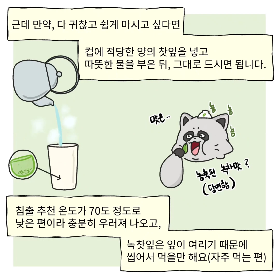 따뜻하게 우려서도 마시고, 아이스티로 즐기기에도 좋습니다. 요즘은 녹차를 꼭 에스프레소처럼 아주 진하게 농축하여 우려먹는 방식이 유행하고 있어요. 이를 농차,라고 부릅니다.