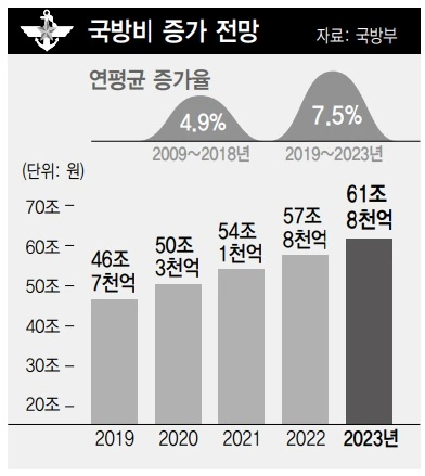 하지만 이러한 방어 시스템이 빠른 속도로 날아오는 북한의 미사일을 모두 타격할 수 있지는 장담하지 못합니다. 북한의 핵미사일이 늘어날수록 방어체계가 실효성도 떨어질 수밖에 없죠. 국방부는 2022~2026 국방중기계획에서 전방위 위협 억제 강화를 위한 '한반도 권역 상시 감시체계'를 발표했습니다. 정찰 위성과 레이더의 추가 배치, 기존 패트리어트 성능 개량, 천궁 등 한국형 미사일 요격무기 대폭 도입, 스텔스 전투기 도입, 한국형 아이언돔 개발 착수 등의 목표를 같이 제시했죠. 물론 이런 전력 증강에는 당연히 천문학적인 돈이 필요합니다. 우리나라의 국방비는 매년 증가해왔지만 특히 북한의 핵무력 완성이 선언된 시기인 문재인 정부 들어서 국방비의 증감률은 7.5%에 달했죠.