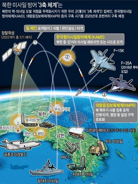 현재 우리나라의 미사일 방어 체계는 크게 3축 체계로 설명됩니다. 하나는 북한의 핵 위협에 대응해 한미가 연합하여 선제 타격하는 킬 체인(Kill Chain) 전략이고, 다른 하나는 한국형 미사일 방어체계(KAMD)라 하여 날아오는 적의 미사일을 공중에서 요격하는 방어 미사일 시스템을 구축하는 것입니다. 2017년 경북 성주에 설치된 싸드(고고도 미사일 방어, THAAD)와 주요 미군기지에 설치된 패트리어트(PAC-3)가 이에 해당하고, 이지스 함선과 한국형 미사일 방어 미사일도 개발되고 있습니다. 마지막은 대량응징보복전략인데 상대방이 선제공격을 한다면 말 그대로 이에 상응하는 혹은 이보다 더한 보복으로 대응하는 전략입니다.
