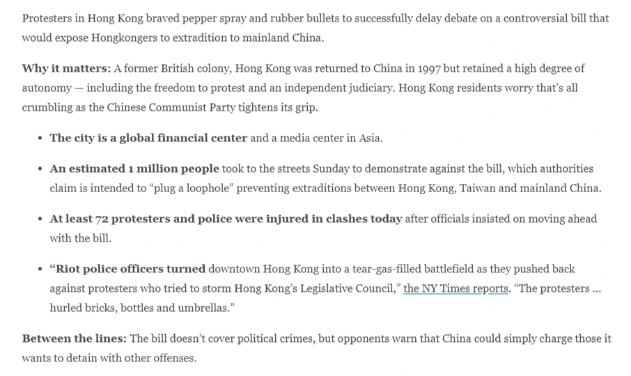 뉴스의 문법을 획기적으로 바꾼 해외 미디어 스타트업 악시오스(Axios)의 시도는 이 중 가장 흥미롭다. 악시오스는 빠르고 효율적인 정보전달을 위하여 길게 늘어진 기사를 없애버렸다. 같은 뉴스를 다룬 뉴욕타임스와 악시오스의 기사 화면은 얼마나 다른가. 기존 뉴스 작성의 문법을 바꿔버린 것만으로도 메시지 전달 방법의 큰 변화가 일어났다.