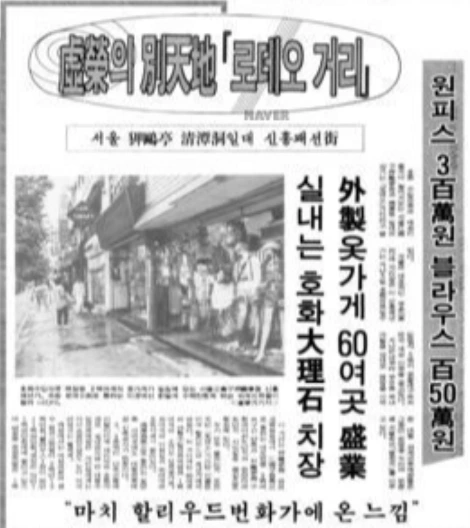 충분히 많아보이지만 제가 조사하지 못한 곳이 훨씬 많을 것 같네요. 한국에서 로데오거리는 어떤 이미지였을까요. 1990년대 기사를 찾아보니, 1990년 7월 8일 동아일보 기사에 '허영의 별천지 <로데오 거리> 원피스 3백만원 블라우스 150만원'이라는 제목의 기사가 있었습니다. 지금도 저 정도 가격의 옷은 아무나 살 수 있는 건 아니죠. 이후에도 '보통여심 주눅드는 로데오거리', '허영전염병 번지는 사치특구'와 같은 강렬한 제목의 기사가 계속 이어졌습니다. (역시 그때나 지금이나 한국 사람들의 기사 제목 뽑는 센스란) 지금은 압구정 로데오거리의 상권이 많이 죽었지만, 당시만 해도 비버리 힐즈의 로데오 드라이브처럼 명품이나 고급 패션 브랜드로 유명한, 시대의 패션을 이끄는 거리였습니다.