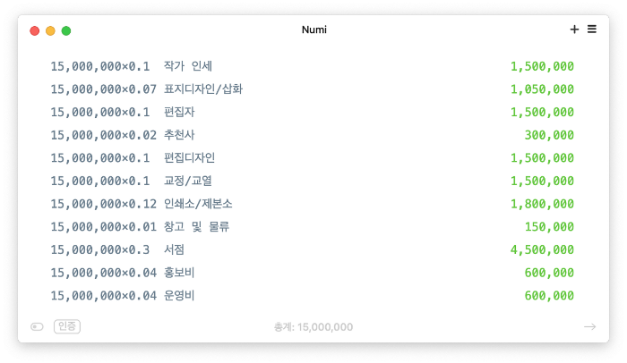 책 한 권도 딱 그렇다. 책을 한 권 팔면 얼마가 남는지 설명하기 위해, 정가 15,000원의 책 1쇄를 1,000부 찍었다고 가정해보자. (요즘 중대형 출판사도 유명하지 않은 작가 책은 1쇄를 500부 찍기도 한단다. 출판 시장이 그만큼 축소되고 있다.) 그리고 아주 이상적으로 한 달안에 책을 만들어 한 달 내에 1,000부를 몽땅 팔았다고 가정해보자. 이 경우 이 책에 관련된 사람들은 한 달에 얼마씩 받아갈 수 있을 것인가. 비즈니스의 핵심. 계산기를 두드려보자.