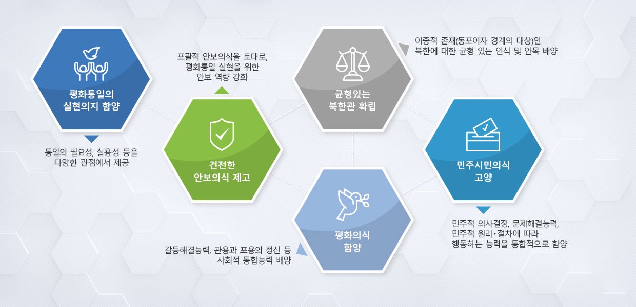 통일교육은 '통일의 형태를 포함한 남북관계 형태에 대한 자신의 입장을 갖는 것이 시민의 권리이자 역할임을 알려주고, 시민 개개인이 미래 남북관계 형태를 선택할 수 있도록 돕는 교육'이어야 합니다.