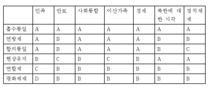 { 민족, 안보, 사회통합, 이산가족, 경제, 북한에 대한 시각, 정치체제 }