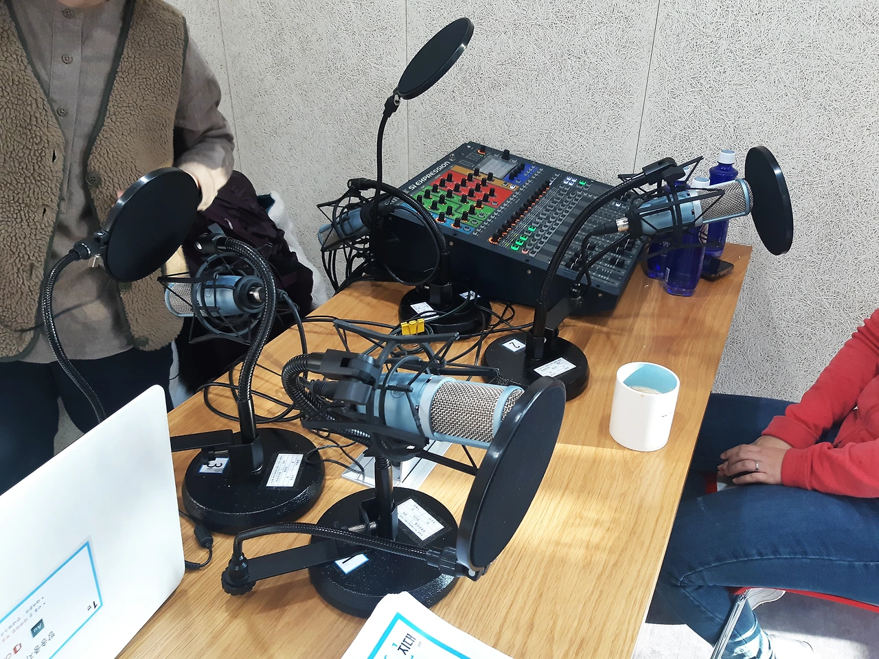 그래 까짓거 돈 좀 쓰지 뭐! 라고 생각했지만. 그래도 많이 쓰는 건 어려우니까. 비교적 저렴한 팟캐스트 스튜디오를 찾았습니다. 먼저 방문했던 곳은 무중력지대 양천 스튜디오. 1시간에 5,000원(VAT 포함)으로 매우 저렴했습니다. 모두가 개인 마이크를 쓸 수 있다는 기대감에 부풀어 찾아갔지만. 시설이 조금 실망스러웠습니다. 한쪽 벽면이 유리로 되어있고, 헤드폰은 노이즈가 심해 사용할 수 없었습니다. 스태프도 전문적인 지식을 갖고 계신 건 아니어서 도움을 받기 어려웠구요. 무엇보다도 공간이 상당히 협소하여 서로 목소리 간섭이 심했습니다. 모니터도 사용할 수 없으니 음량이 어떻게 들어가는지 컨트롤도 불가능하고 총체적 난국. 녹음된 파일은 당연히 만족스럽지 않았죠. 만일 콘솔을 다룰 줄 아는 분이라면 저렴한 가격에 괜찮지 않을까 싶지만, 저희에게는 쉽지 않았습니다.