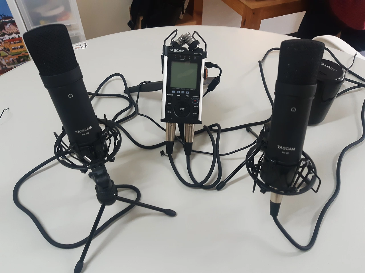 스튜디오도 아니라는 결론을 갖고 다시 요룬의 집에 모였습니다. 사실 TASCAM DR-44WL은 두 개의 마이크를 추가로 연결할 수 있습니다. 팬텀파워(마이크에 전력을 공급하는 기능)도 제공되서 콘덴서 마이크(전력을 연결해야 작동하는 마이크)도 문제 없죠. 애초에 타스캠을 구매할 때도 이 점을 고려해서 구매했었거든요. 오랜 시간 고민하던 저는 지금 레코더에는 이어폰을 연결해서 음량을 체크할 수도 있으니 레코더 마이크+콘덴서 마이크 2개, 이렇게 연결해서 세 명이 각자 마이크를 하나씩 쓰기로 결정합니다!!