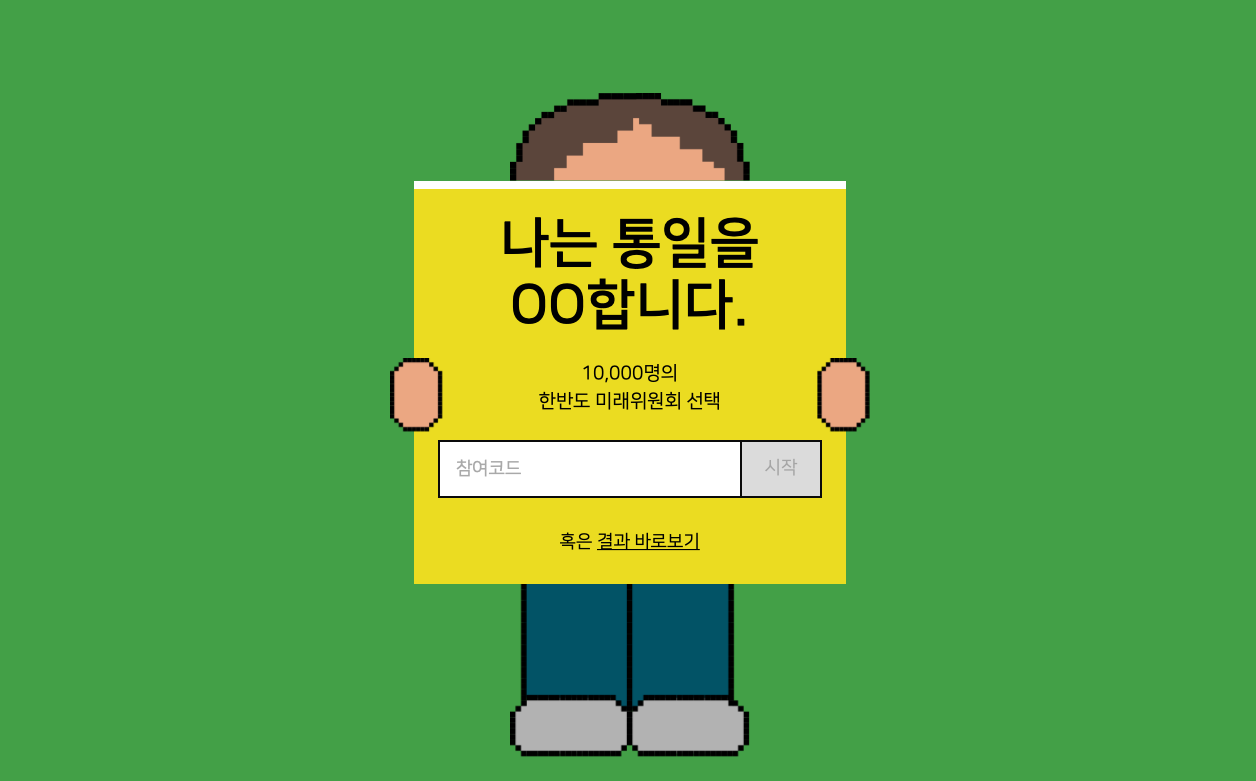 1. 웹페이지를 만들었다. 사회과학 게임북을 표방하는 <나는 통일을 땡땡합니다>. 이 책의 6가지 방안 중 독자 각자의 선택을 공유할 수 있는 웹을 구현하면 어떨까 이야기했다. 그리고 그 구현을 도와줄 팀을 가까운 곳에서 찾았다. 청년청에 같이 입주하고 있던 S스튜디오 측에서 기꺼이 도와주기로 한 것이다. 최악의 경우 구글 폼으로 하려 했던 설문조사는 이렇게 버젓한 웹페이지를 갖추게 되었다.
