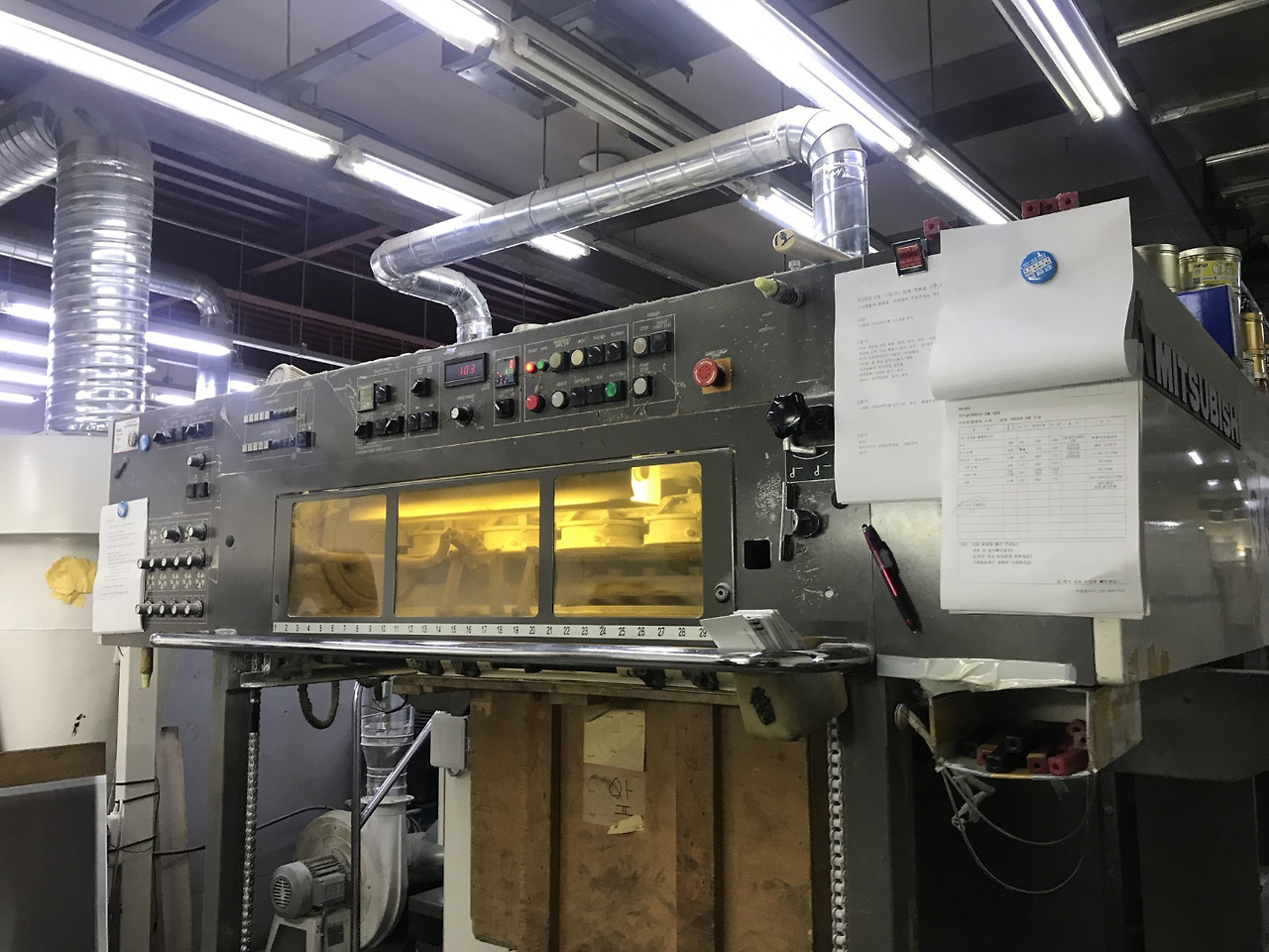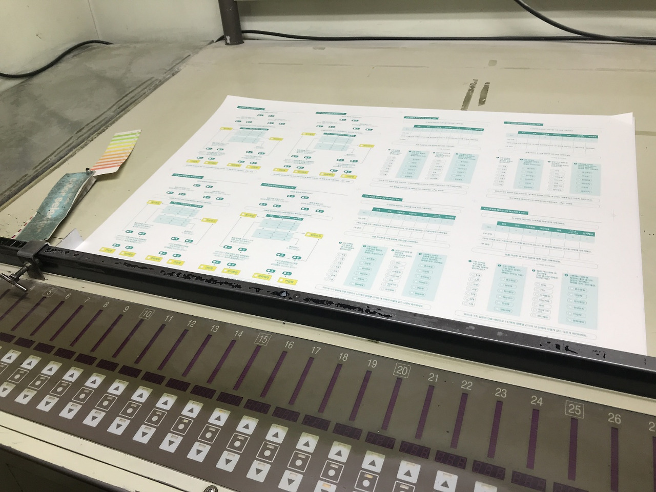 1층 출력실에 들어서자 메케한 종이 먼지와 기름 냄새가 훅 끼쳤다. 공장 바닥 군데군데 찢겨나간 종이들로 어수선했고, 인쇄기계는 한 번도 제대로 쉬어본 적 없다는 듯 먼지를 뒤집어쓰고 있었다. 인쇄기장님은 2시 미팅에 맞춰 샘플 페이지를 미리 뽑는 중이었다. 기계 앞에는 <나는 통일을 땡땡합니다>의 작업 의뢰서가 붙은 것이 보였다. 책이 인쇄된다는게 문득 실감이 났다.