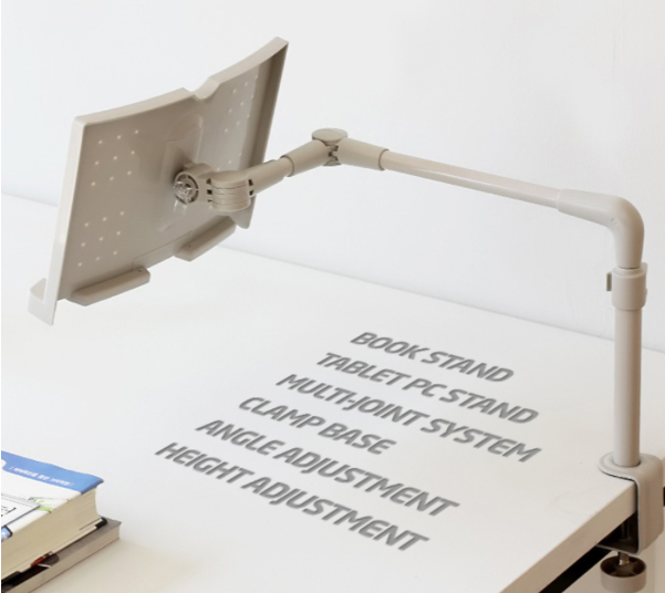시중에는 다양한 북스탠드가 판매되고 있습니다. 일단 소재로 크게 구분이 됩니다. 나무 제품과 플라스틱 제품으로 구분할 수 있습니다. 간혹 두꺼운 종이 재질의 북스탠드를 만나볼 수도 있어요. 그 다음은 북스탠드의 형태인데요. 형태의 면에서는 크게 다르지 않습니다. 책을 세워야 하는 기능이 우선이므로 스탠드를 받치는 바닥과 책의 기울기를 조정할 수 있는 넓은 면의 판, 책을 고정하는 고정장치를 가지는 등의 대동소이한 형태입니다. 결국에는 테이블 위에 올려 두어야 하는, 즉 일정 정도 책상 위의 지분을 차지할 수밖에 없는 구조다~ 이 말입니다.
