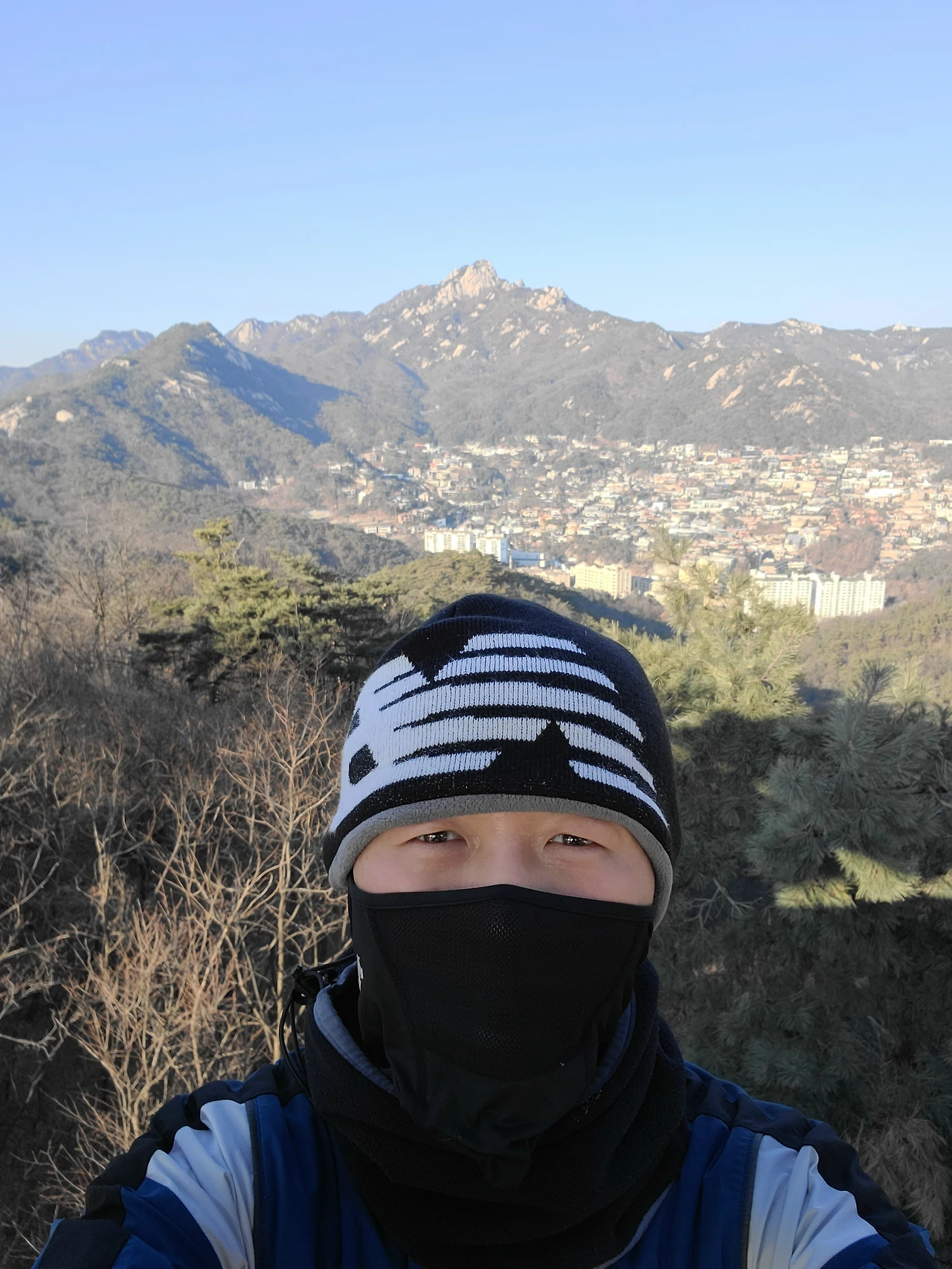 북악팔각정에 도착하여 멀리 보이는 평창동 마을과 보현봉을 배경 삼아 사진을 한장 찍었다.