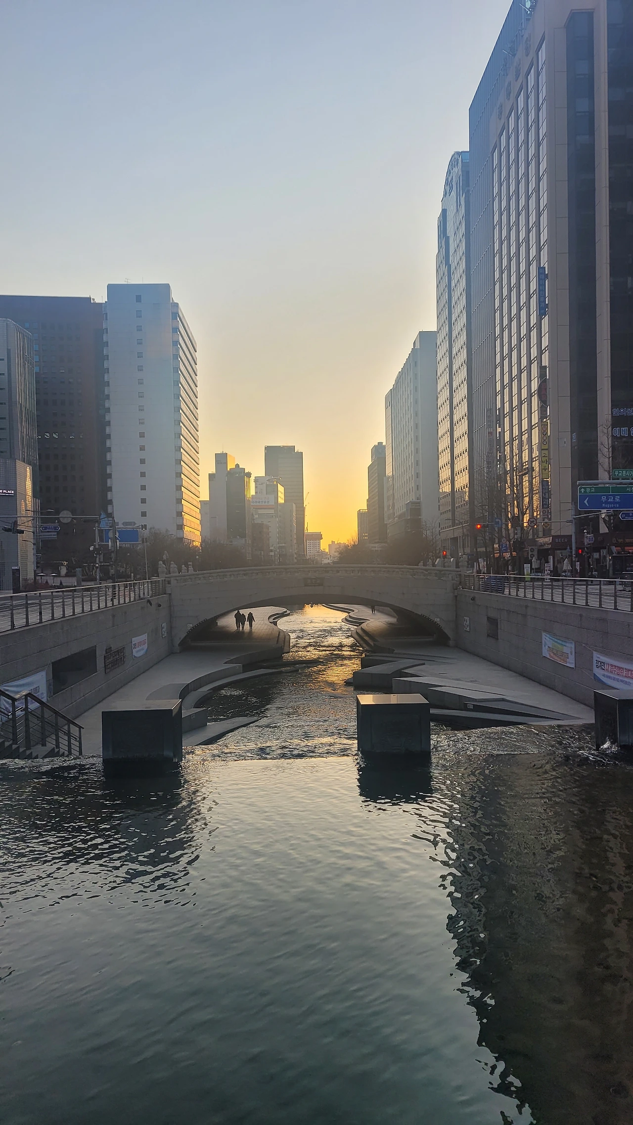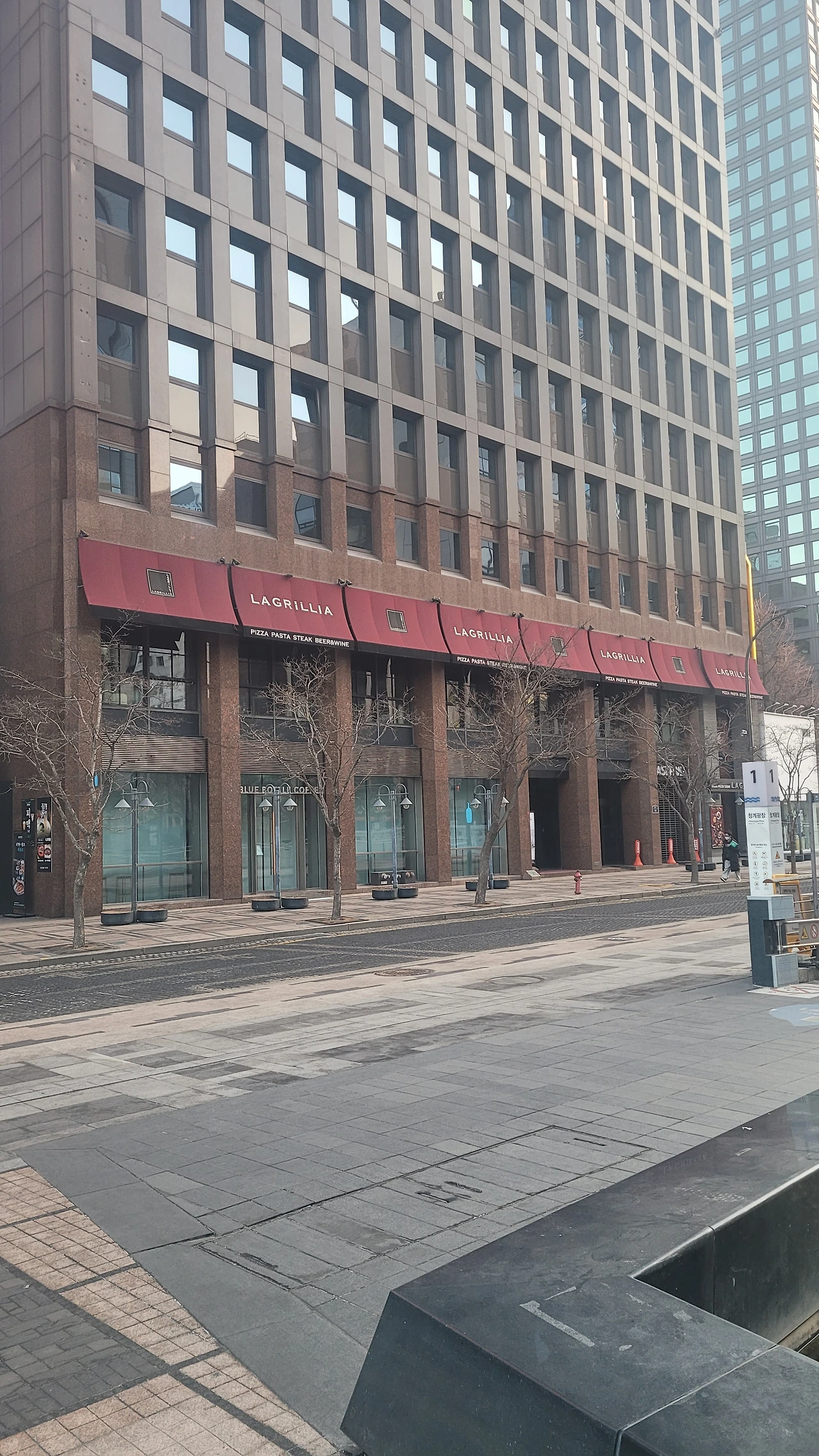 청계 소라 광장에서 숨을 잠시 고르고 사진을 남겼다. 멀리 해가 떠올라 붉은 빛이 도는 것이 참으로 멋있었다. 왼쪽으로 라그릴리아와 최근에 오픈한 블루보틀 매장을 볼 수 있었다.