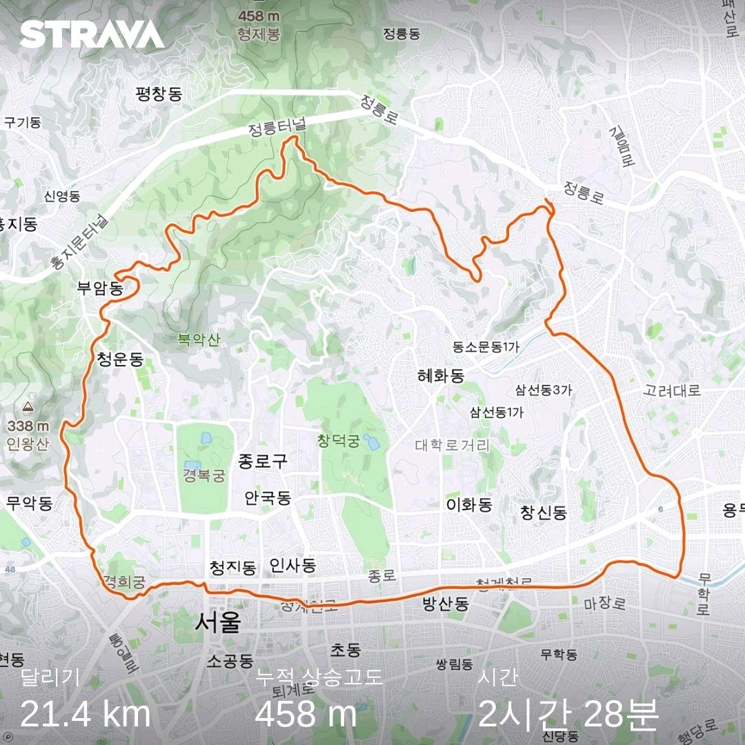 돈의문 박물관 마을을 지나면 본격적인 오르막 길이 나온다. 바로 인왕산으로 올라가는 길. 인왕산은 약 330m 정도의 높지 않은 산이지만, 정상 부근은 상당히 가파른 산이다. 접근성이 좋고, 금방 다녀올 수 있는 산이다 보니 서울 사람들에게 꽤 인기 있는 산이 되었다. 요즘은 젊은 분들도 소규모 그룹을 만들거나 혼자서 자주 찾는 산이 되었다. 오늘은 인왕산 정상으로 가는 길을 선택하지 않고, 인왕산 둘레를 도는 길을 선택하여 인왕산 호랑이 상과 초소책방을 지나 윤동주의 시인의 언덕, 자하문을 지나 부암동 길, 북악 팔각정 코스로 해서 정릉으로 도착하는 길을 선택하였다. 다행히 인왕산 둘레길은 가파르지 않고, 북악 팔각정도 완만한 오르막이 계속 이어지다보니 부암동 쪽에서 잠시 에너지 보충한 이후로는 쉬지 않고 올라 북악 팔각정까지 갈 수 있었다. 이 길을 뛰다보니 작년 10월에 출전했던 ‘서울 100km 트레일 러닝 대회’ 가 생각 났다. 인왕산-북악팔각정-보국문(청수대암문) - 백운대 - 영봉으로 이어지는 서울 100km 트레일 러닝 대회 A코스는 내가 달린 가장 긴 거리이다. (약 53km). 오랜만에 오르막 산악길을 달리다보니 “와 그 때 그걸 어떻게 뛰었을까?’ 내 자신이 대단하게 느껴지고 자랑스럽게 느껴지는 순간이었다.