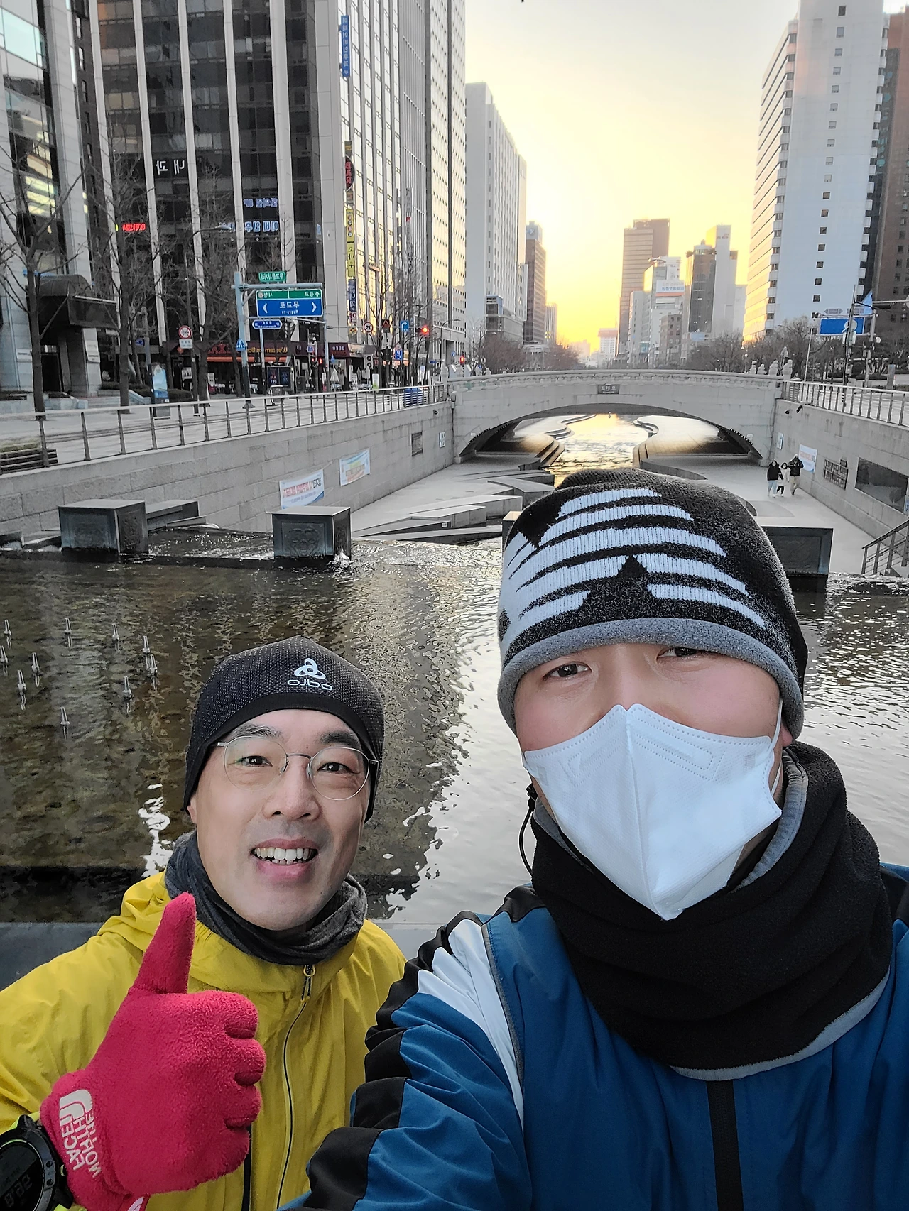 정릉역에서 만나서 간단한 인사를 나눈 뒤, 아리랑 고개를 넘어 돈암동 쪽으로 이동하여 성북천 초입에 접어 들었다. 거기서 부터 청계천 합류 지점까지는 바닥이 우레탄 이라서 달리기에 훨씬 좋다. 가볍게 km당 6분대 페이스로 달리면서 담소도 나눌 수 있었다. 청계천 합류지점부터는 좀 더 속도를 내서 km당 5분대로 달렸고, 청계 소라 광장(동아일보사 앞) 도착에는 km당 4분50초까지 페이스를 끌어 올릴 수 있었다. 개인적으로 마스크를 쓰고 4분대를 뛰면 숨이 힘들다.