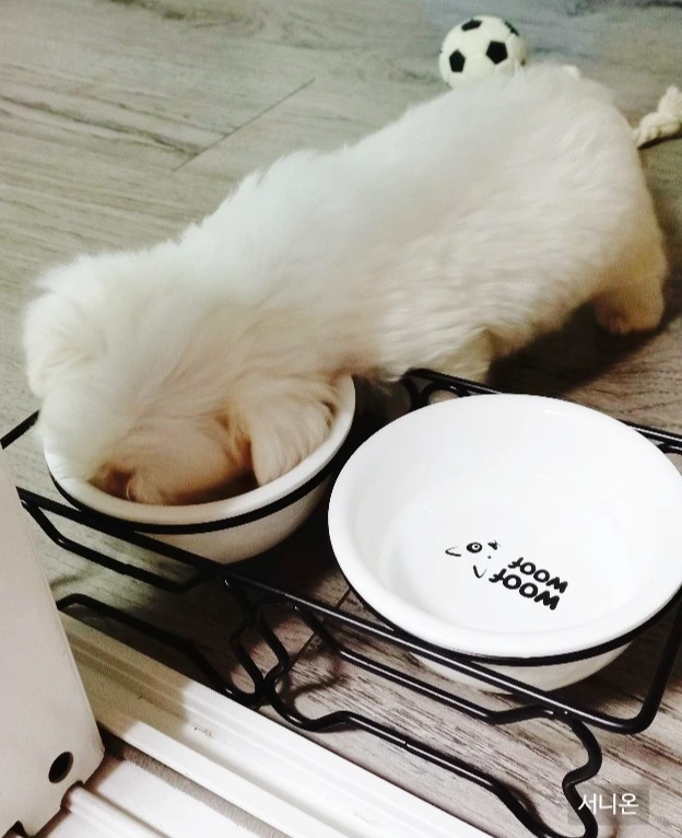 "콩알아, 밥 먹자. 아이고, 요 녀석 코 박고 금세 다 먹었네.