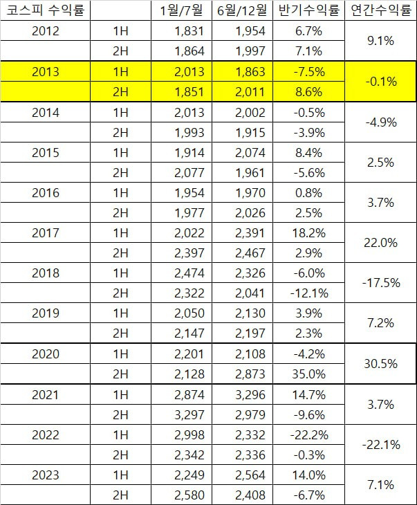 2012년 이후 코스피 지수에 상고하저는 딱 두 번 있었다.