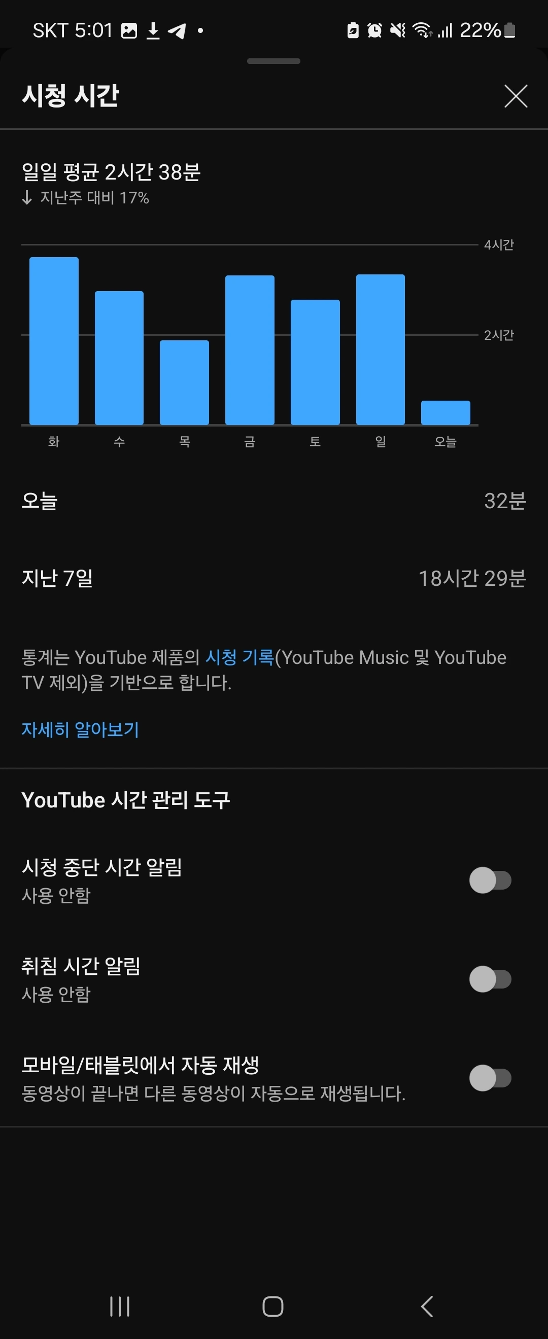 지난주는 일평균 2시간 38분 유튜브를 봤다.