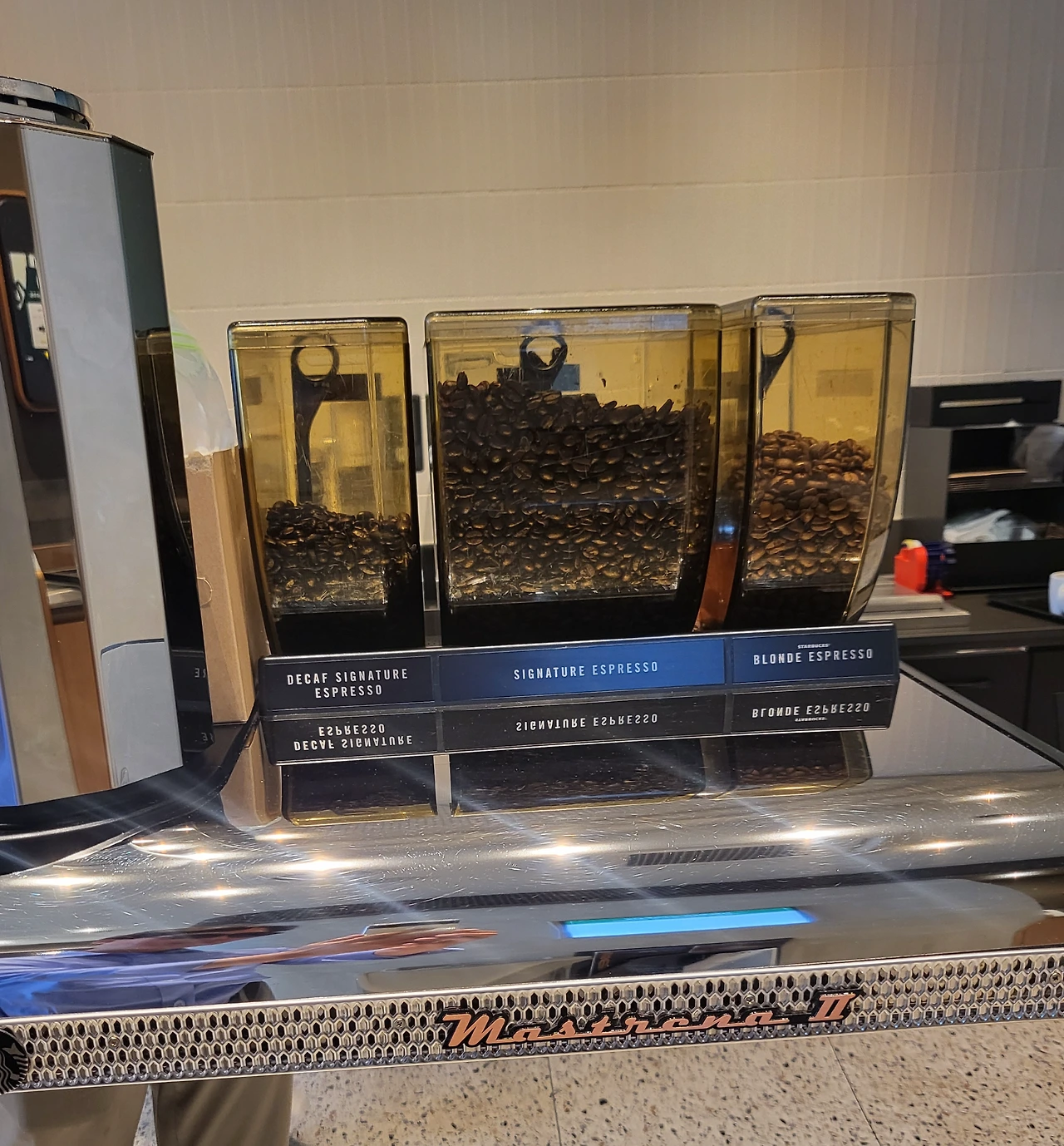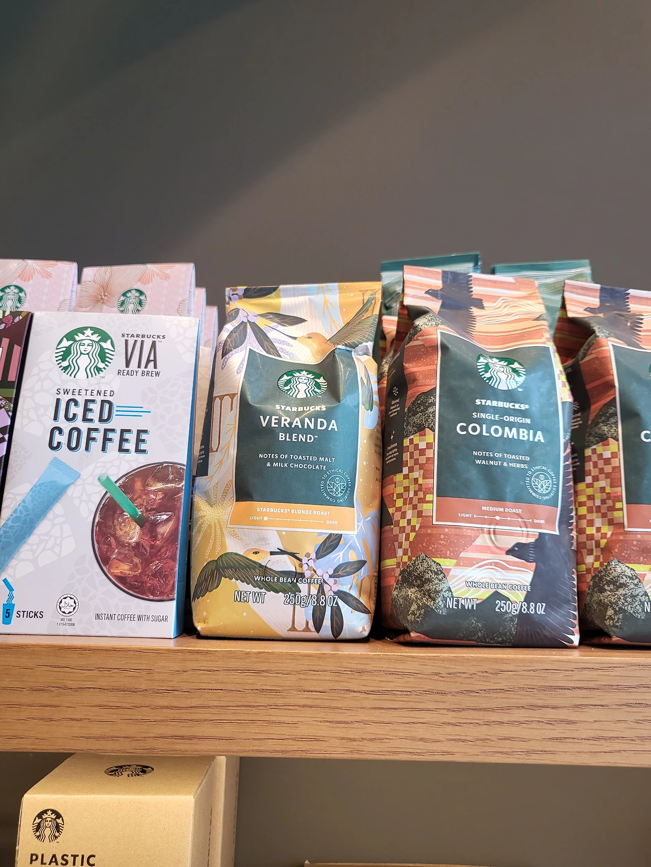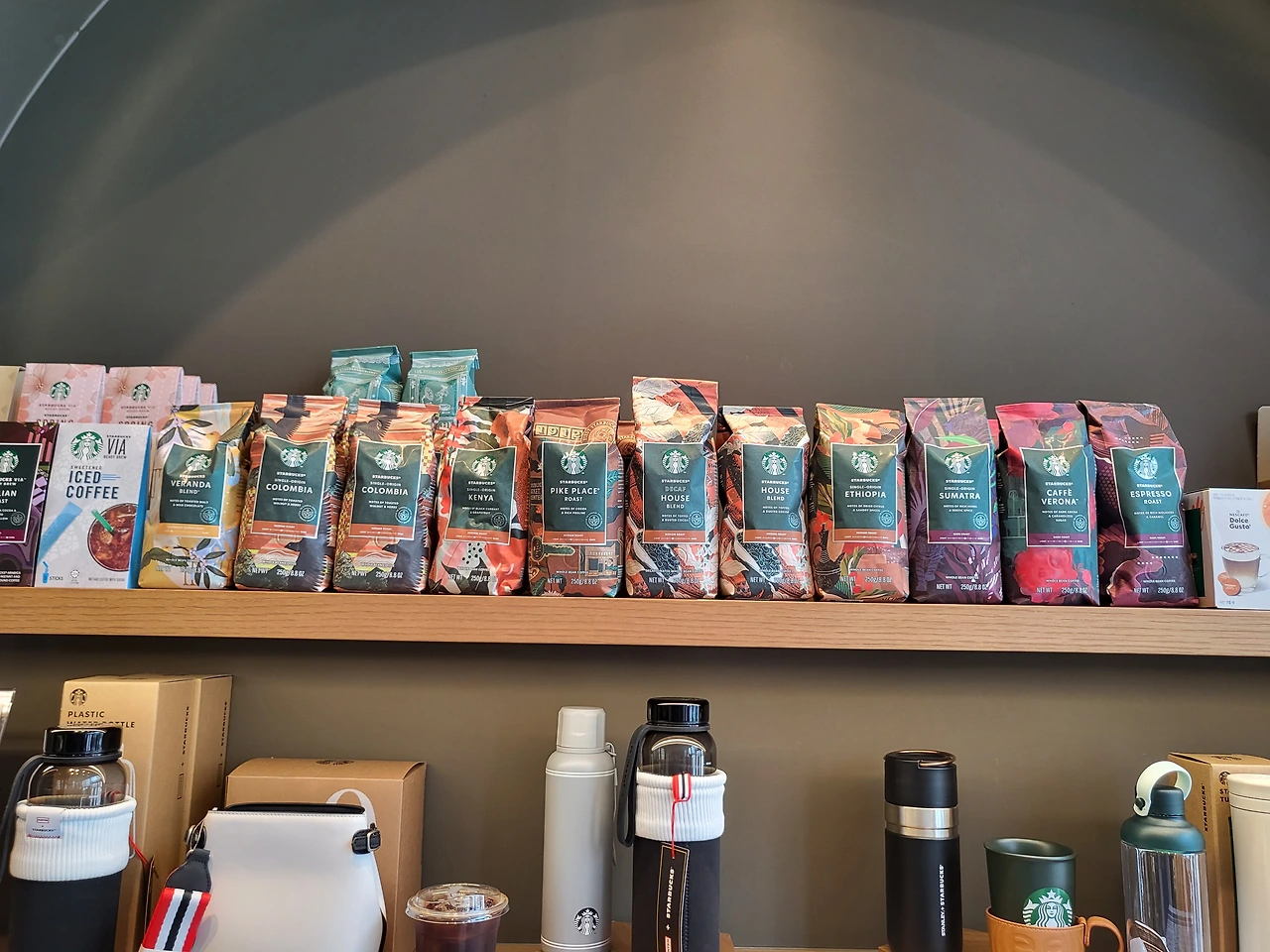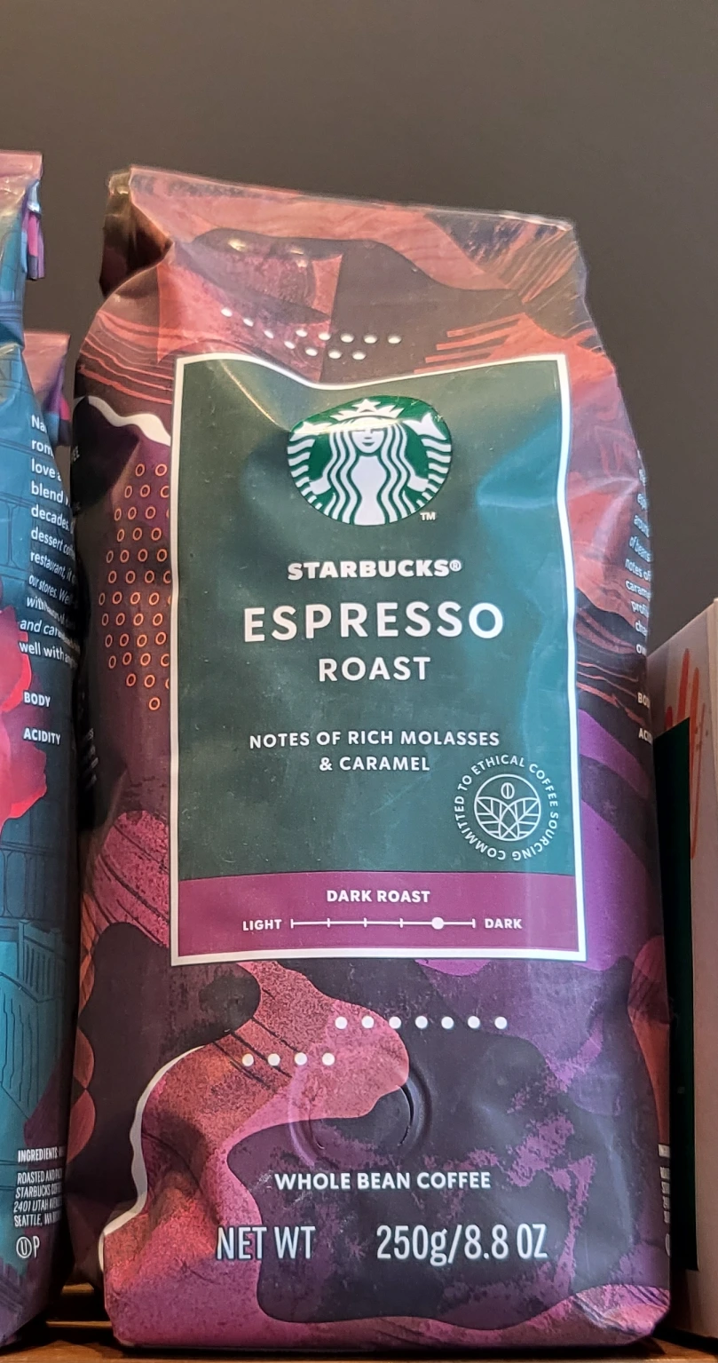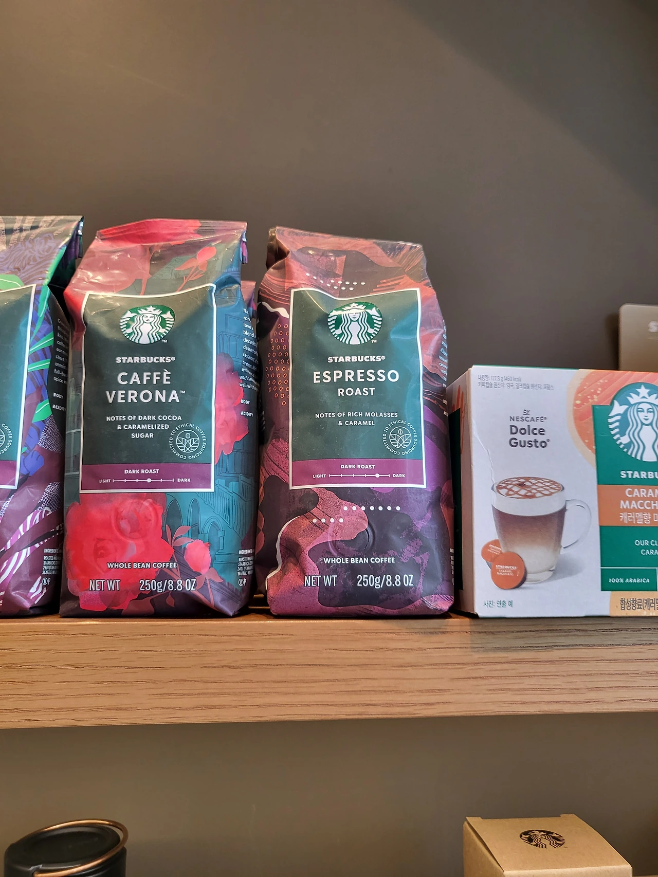 스벅에서 가장 많이 쓰는 시그니쳐 같은 원두를 판매하고 있으니까 보여드릴게요. 선반 오른쪽 끝에 보시면 espresso roast라고 쓰여있는 봉투 보이시죠. 그게 아아 에 쓰이는 원두예요. 주로 스벅에서 이 원두를 사용하고 있고 투샷으로 사용을 합니다.