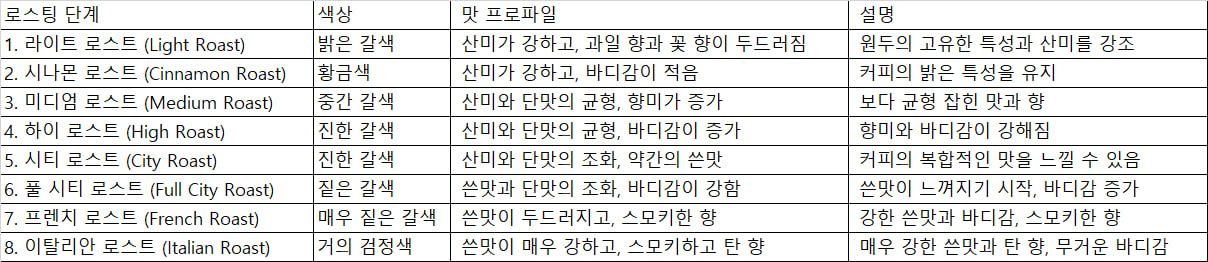 보통 라이트 로스팅부터 다크 로스팅까지 8단계를 구분하면 아래 표와 같다.