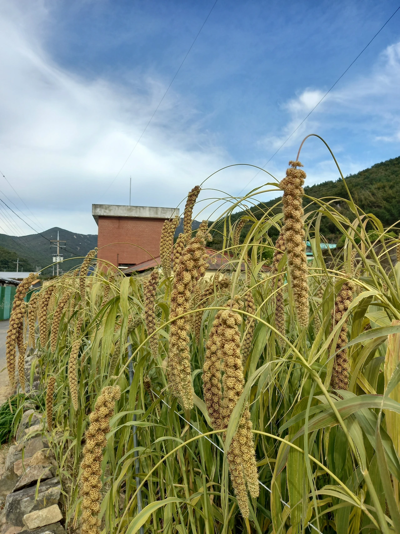 하늘은 푸르고 오후의 시간은 아직 꼬리를 드리우고 있으나 , 오늘의 걸음을 접기로 한다. 고개들어 하늘을 보니 금산이 고개를 빼꼼히 내밀고 산길을 열어 놓고 있다. 마을에 심어 놓은 조 이삭을 만져보다가 아주 오래오래 삭아버린 어린 시적의 추억을 반추해 본다.