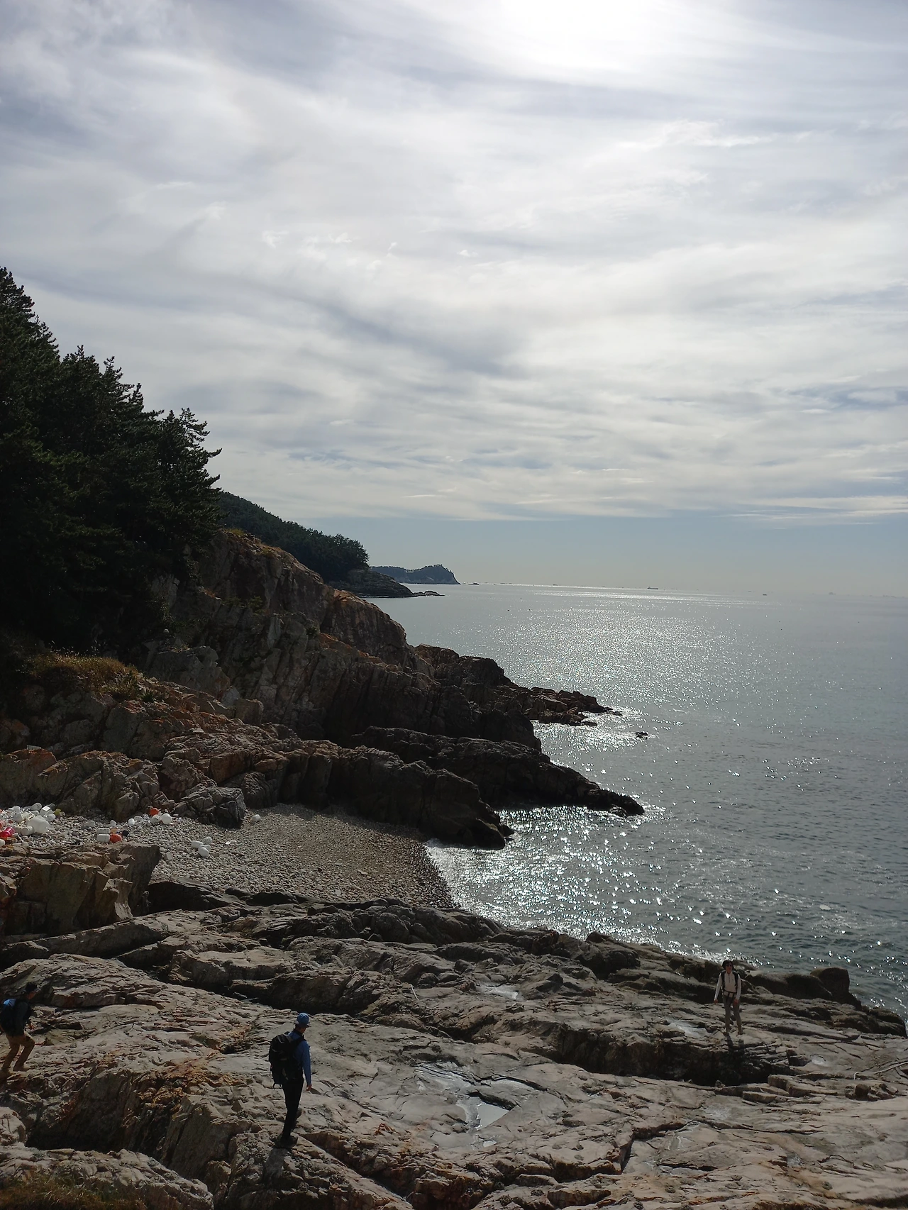 바다를 붙들고. 바위가 되어 다시 하나 기다림을 안고 수면을 구르는 윤슬을 만난다. 길을 걷는 사람들도 덩달아 바다를 바라다본다.