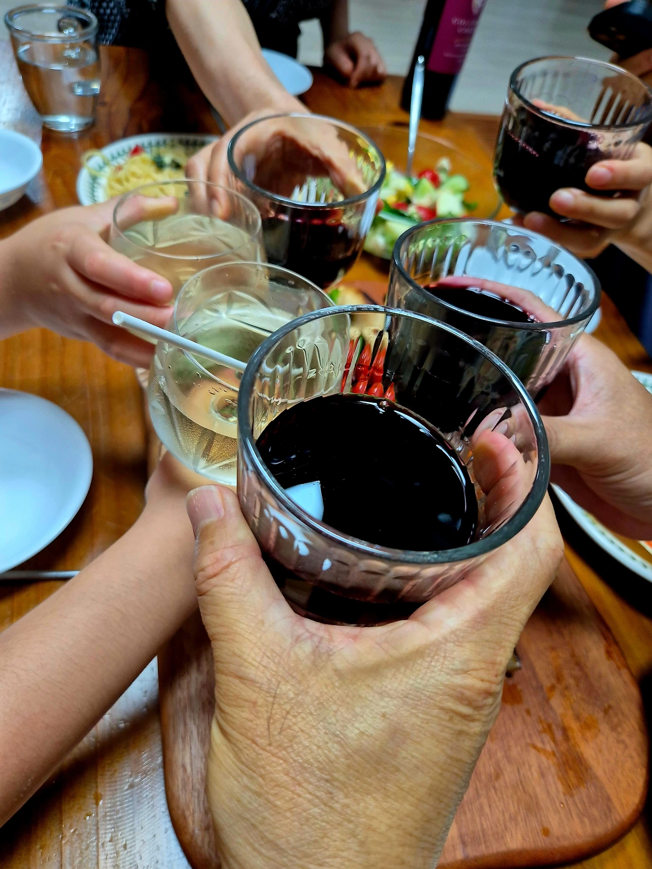 오늘은 와인으로 판을 벌인다. 아가들은 사과주스인데, 3학년 짜리 손녀는 화이트 와인이란다.
