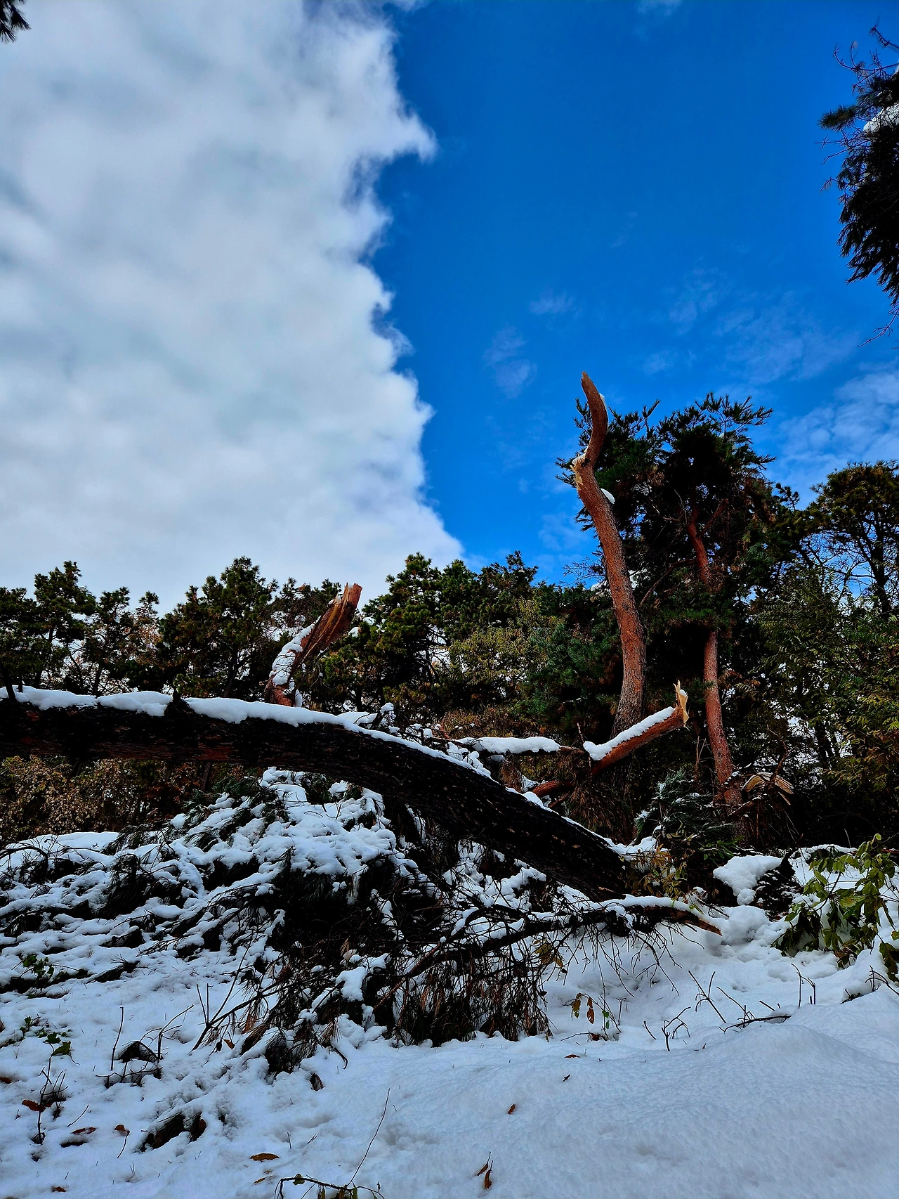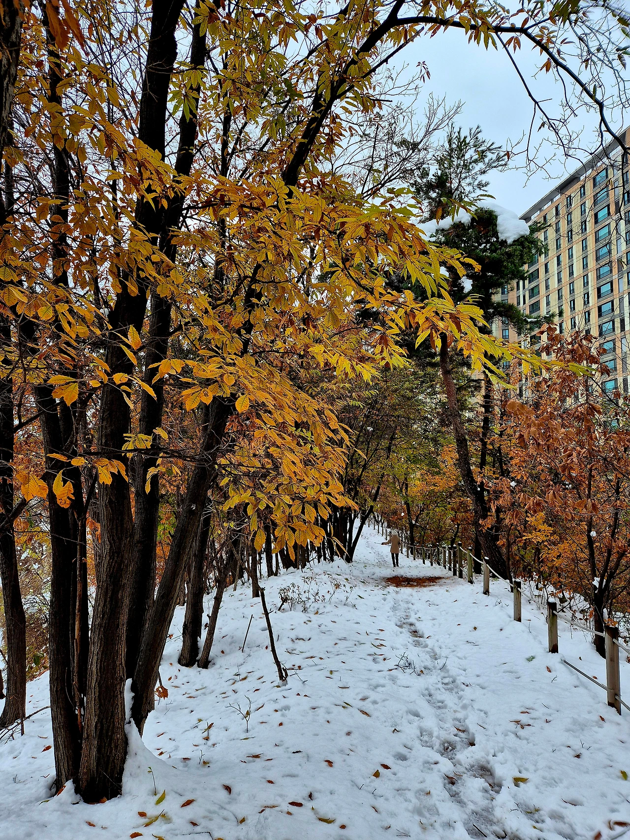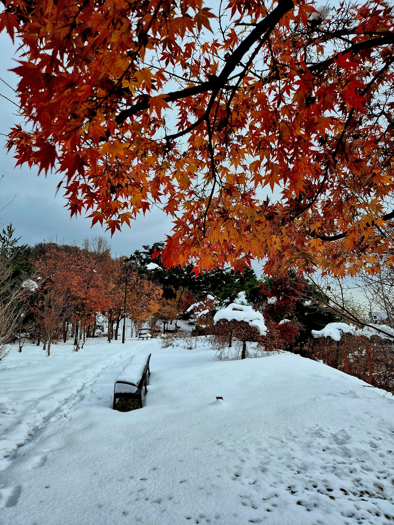 폭설을 맞으면서 더 아름다운 가을 이야기를 하고 있는 숲