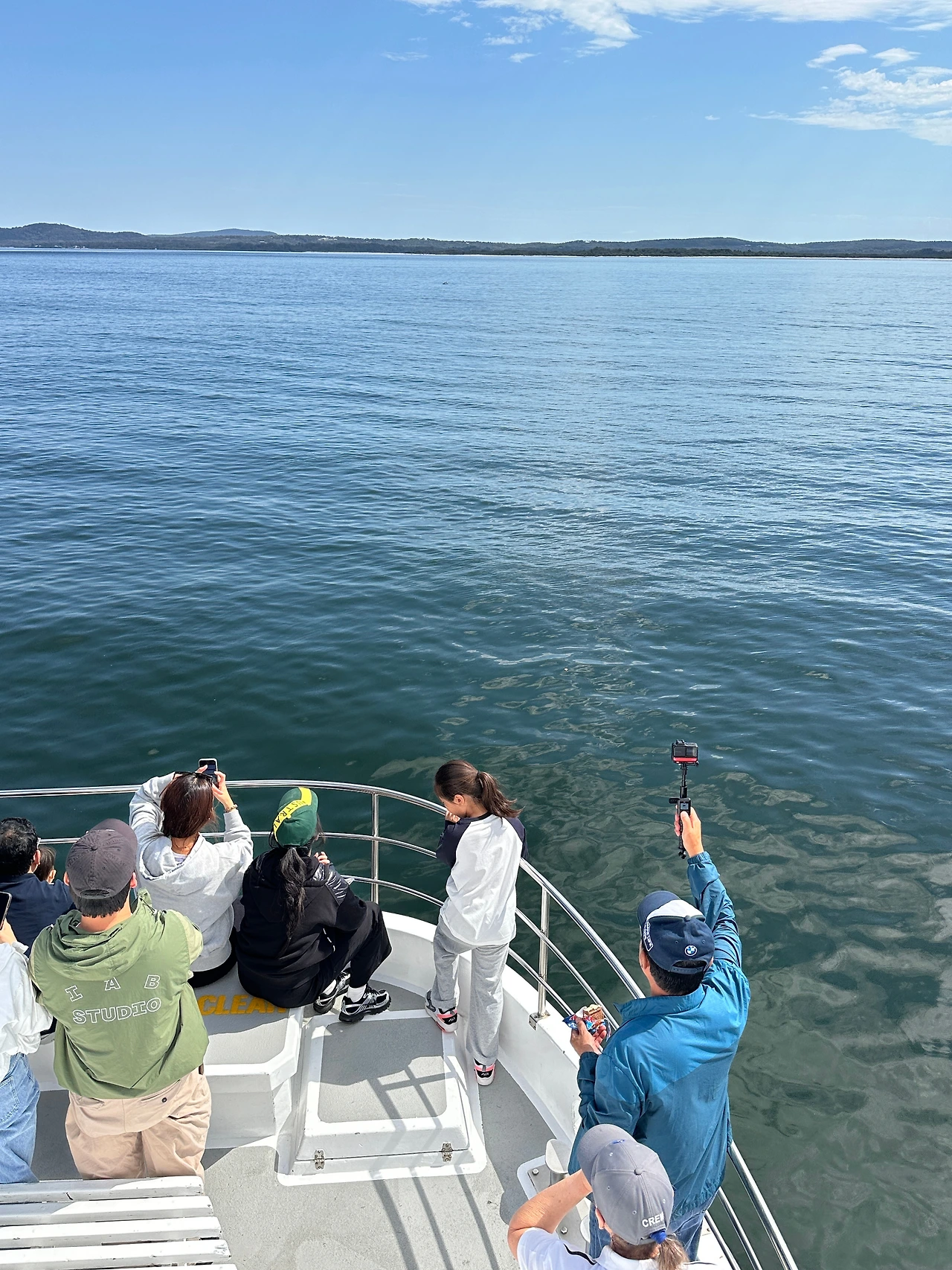 배는 타루아 강인지, 포트스테판스만Port Stephens Bay인지 어귀에서 멈칫멈칫 어슬렁거리고 있다. 1층으로 내려간 사람들은 난간을 붙잡고 어디선가 불쑥 나타날 돌고래를 향해 투척할 환호성을 한 뭉치씩 움켜쥐고 저마다의 마음으로 기다리고 있다. 여행의 한 단면이다.