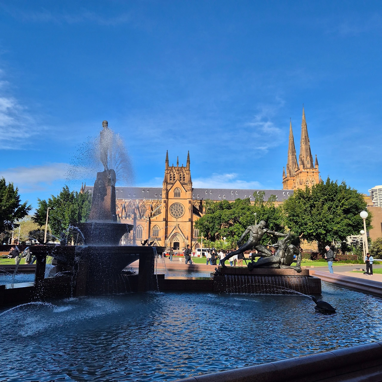 세인트 메리 대성당St Mary's Cathedral이 건너다 보인다. 호주 가톨릭 공동체의 영적인 중심지로 1821년에 지어졌으나 화재로 소실되어 1868년에 재건축을 시작하여 오랜 기간에 걸쳐 완성되었으며, 특히 쌍둥이 첨탑은 2000년에야 완공되었다고 한다. 노란빛이 은은하게 감도는 사암砂岩, Sandstone으로 외벽을 지어 햇빛이 비치면 장엄하게 빛난다고 한다. 미사 외에도 관광객에게 개방된다고 하는데 박물관과 아름답다는 QVB을 구경하기로 해서 아름다운 외관을 보는 것으로 만족한다.