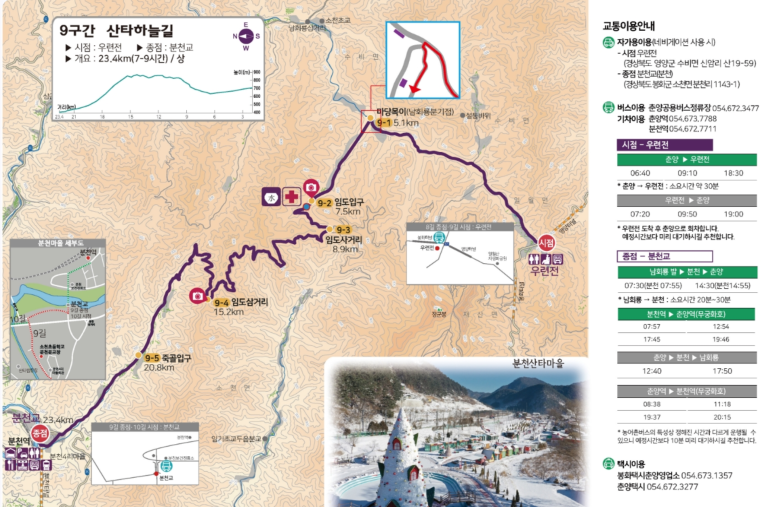 * 분천교에서 9길 걷기를 마친 후에는 분천교 보건지소 정류장에서 오후 3시에 출발하는 춘양행 버스를 타고 돌아오면 된다. 단, 2시 55분부터는 정신 차리고 분천교 방향을 잘 지켜봐야 한다. 버스가 정류장 옆 분천교에서 돌려 나가므로 놓치지 않도록 해야 한다.