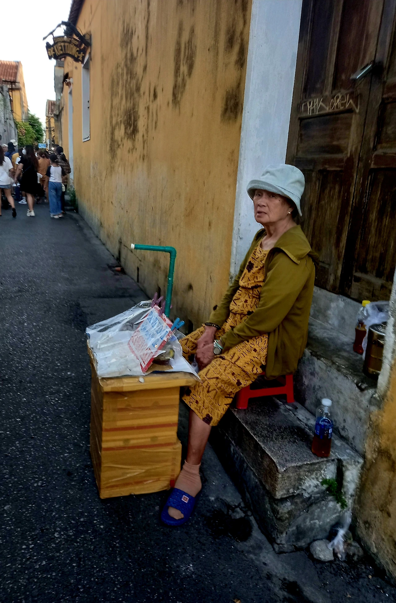 좁은 골목이 웅크린 어깨를 펴 길을 조금 넓히는 곳에 그녀의 작은 노점이 있었다. 하얀 모자로 자신이 살아온 삶의 주름살을 가리고 손바닥만 한 의자에 앉아 있는 여인. 15인치 노트북만 한 작은 나무 상자 위에 찹쌀떡 같은 것을 몇 개 올려놓고 오가는 사람들의 시선을 끌어당기고 있다. Bánh xoài 망고떡. 흰색이고 하얀 고물이 묻어 있는 것이 영락없는 찹쌀떡이다. 통영의 꿀빵이 생각났고, 경주의 찰보리빵이 떠올랐다. 아무나 만들어서 같은 이름으로 팔 수 있는. 나중에 구시가지를 돌아다니다가 알았다. 두 개 30,000 동. 싸다. 1.500원이면 싼가? 저것 팔아서 자식들 먹이고 입혀서 학교에 보냈을 것이다. 좌판에 가난이 덕지덕지 묻어. 있다. 사람은 다 그렇게 산다.