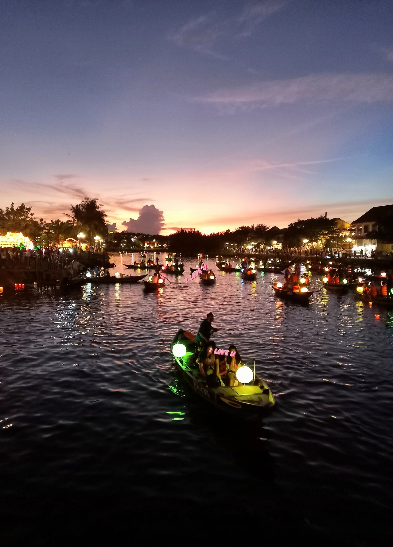 An Hoi Bridge 앞에 서 있었다. 황혼이 내릴 무렵 투본강은 일제히 불을 밝혔다. 강을 따라 이어지는 가게마다 찬란한 등을 내 걸었다. 덩달아 가로등도 희미한, 그래서 애절한 등불을 하나씩 들고 늘어섰다. 사람들은 환호했다. 그리고 마음을 느슨하게 풀어놓았다.