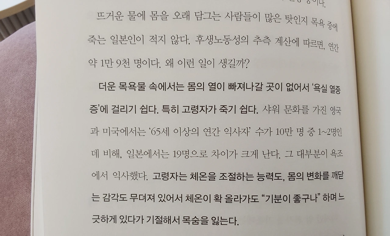 더운 목욕물 속에서는 몸의 열이 빠져나갈 곳이 없어서 욕실 열중증에 걸리기 쉽다. 대부분 욕조에서 익사했고 특히 고령자가 많이 죽었다. 고령자는 체온을 조절하는 능력도, 몸의 변화를 깨닫는 감각도 무뎌서 체온이 확 올라가도 '기분이 좋구나'하며 느긋하게 있다가 기절해서 목숨을 잃는다. 탕에 몸을 담그는 열탕 사우나가 아닌 그냥 샤워 문화를 가진 영국과 미국은 사망률이 낮다.
