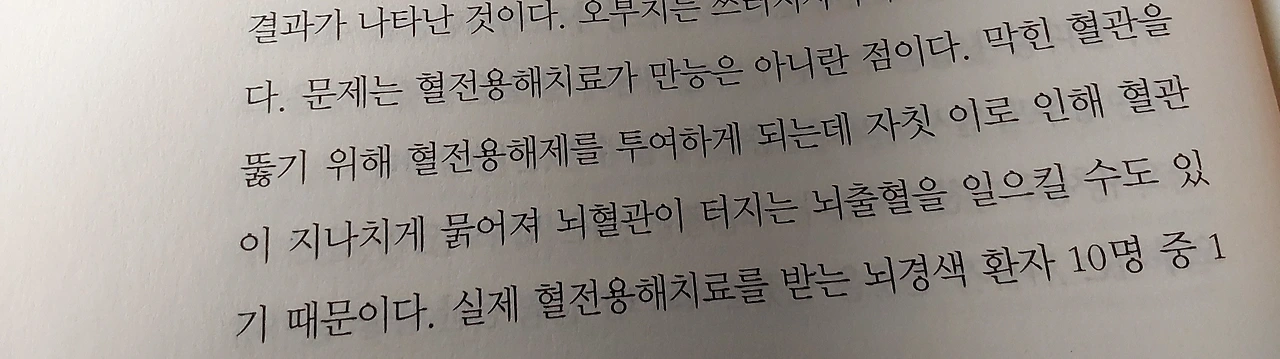 뇌출혈, 심장질환 등 혈액에 문제가 발생한 환자들에게 남은 평생 처방되는 게 아스피린 같은 혈전 용해제다. 혈액이 맑아지는 게 아니라 묽어지게 한다. 환자들은 의사의 처방만 무조건 믿고 약을 꼬박꼬박 챙겨 먹는 경우가 많다. 하지만 약 설명서를 읽고 그 위험성과 부작용은 환자 스스로가 체크해야 한다. 자신의 상태를 체크하지 않고 의사의 처방만 꼬박꼬박 따르는 고분고분한 환자는 그 약으로 인해 갑자기 죽을 수 있기 때문이다.