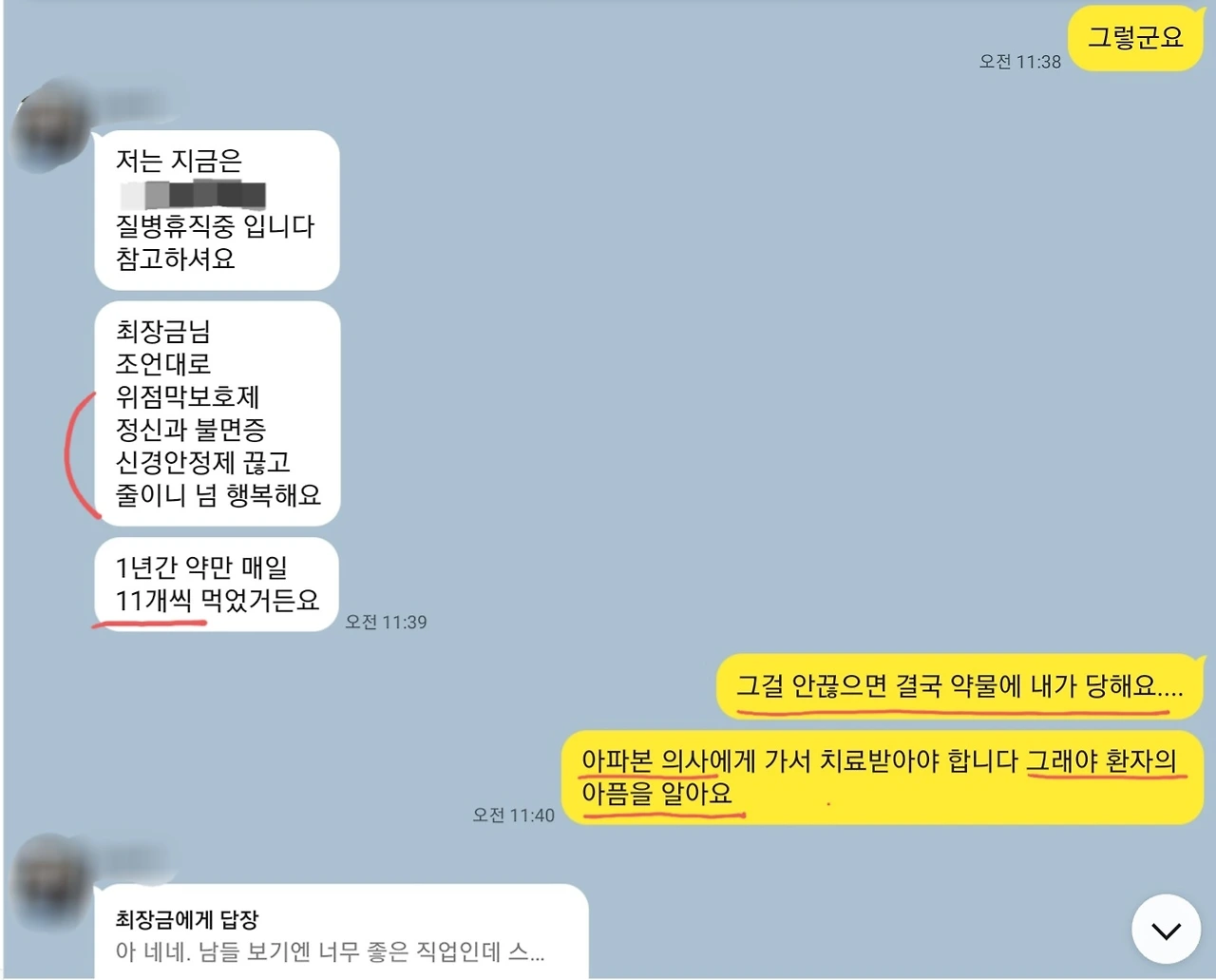 최장금) 약을 안 끊으면 결국 약에 내가 당해요. 병원에 가서 치료를 받는다면 아무 의사에게 가지 말고 아파본 의사에게 가서 치료받아야 합니다. 아파본 의사는 절대 약을 10개나 넘게 처방하지 않습니다.