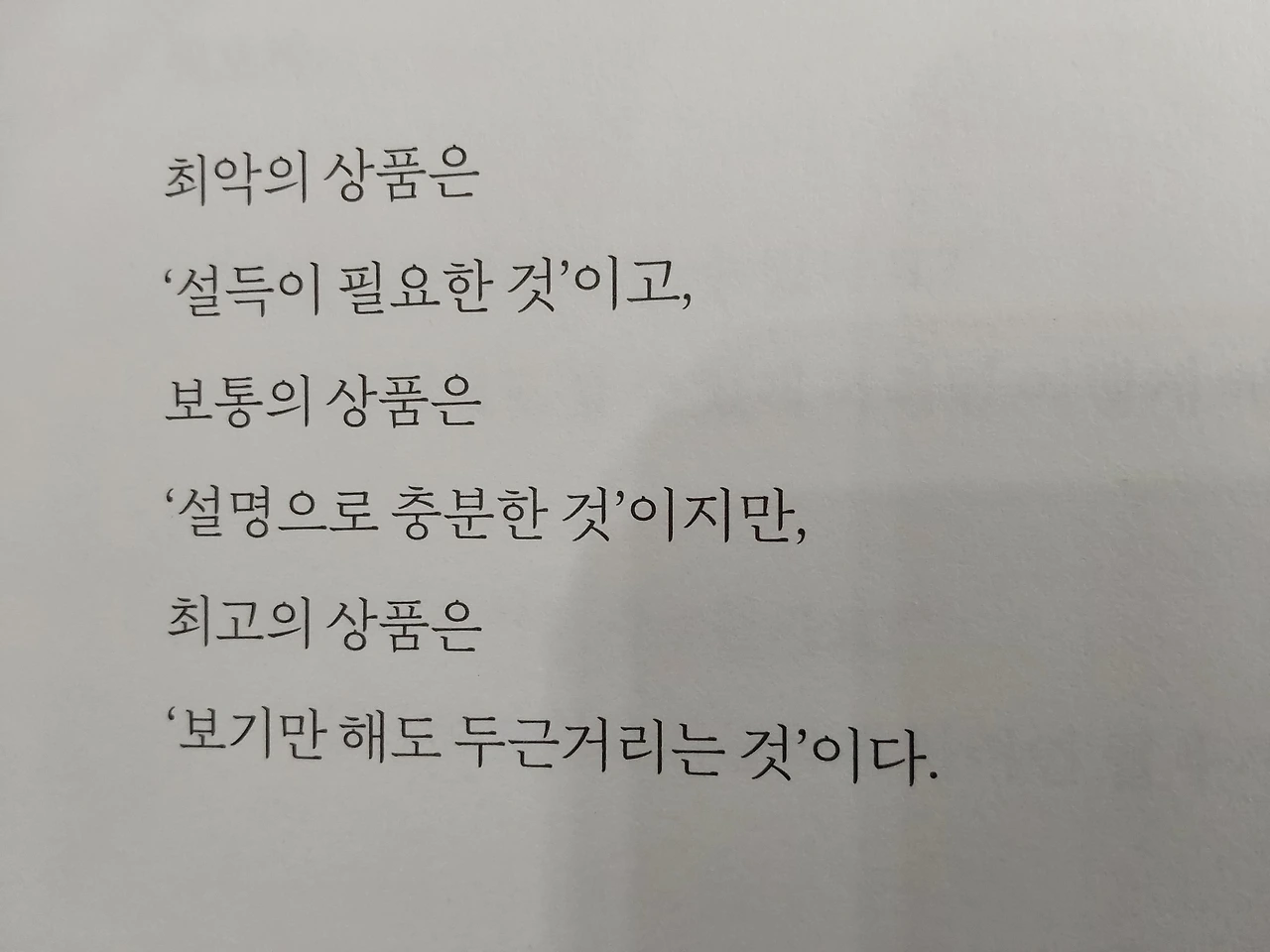 최악은 상품은 설득이 필요한 것이고 보통의 상품은 설명으로 충분한 것이지만 최고의 상품은 보기만 해도 두근거리는 것이다.