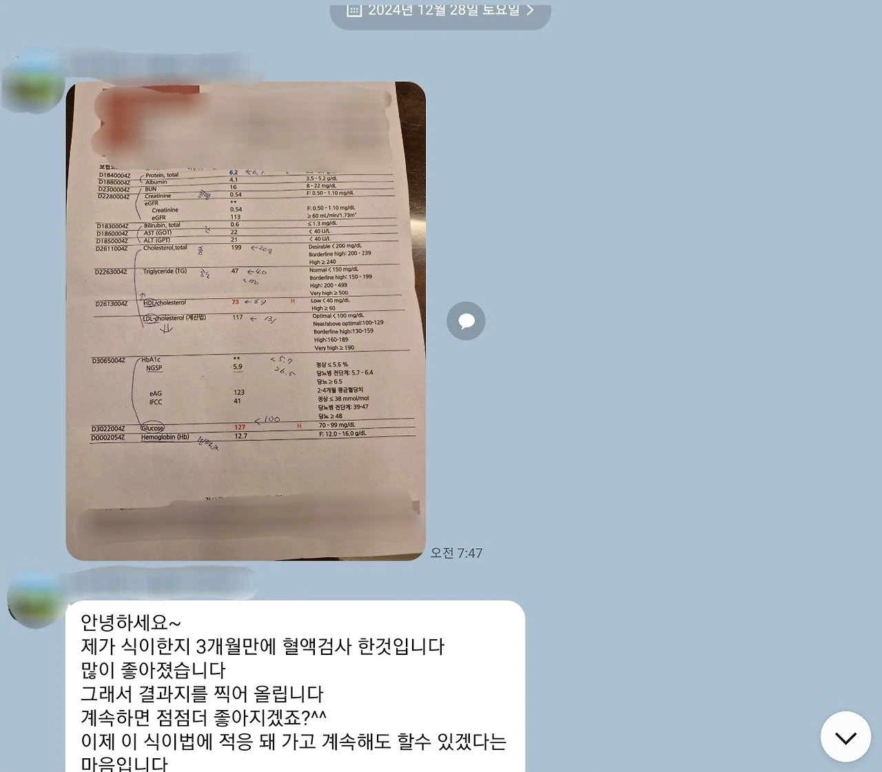 약을 끊고 식이한지 3개월만에 혈액검사 했습니다.