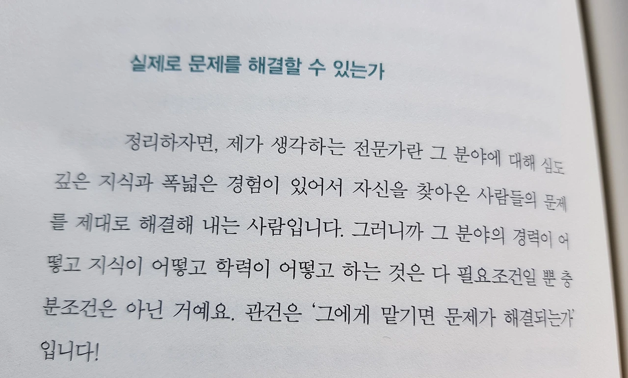 전문가의 조건은 그 문제를 해결할 수 있나? 없나? 그뿐이다. 경력 지식 학력이 아무리 많고 높다 한들 문제를 해결하지 못하면 당신이 원하는 전문가가 아니다.