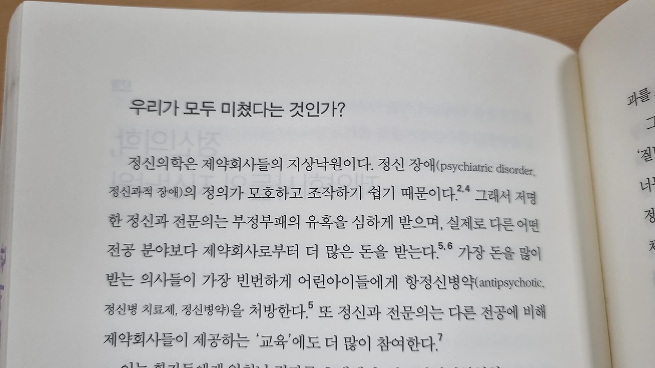 정신의학은 제약회사들의 지상낙원이다. 정신장애의 정의가 모호하고 조작하기 쉽기 때문이다. 그래서 저명한 정신과 전문의는 부정부패의 유혹을 심하게 받으며, 실제로 다른 어떤 전공 분야보다 제약회사로부터 더 많은 돈을 받는다. 가장 돈을 많이 받는 의사들이 가장 빈번하게 어린아이들에게 항정신병약을 처방한다. 또 정신과 전문의는 다른 전공에 비해 제약회사들이 제공하는 교육에도 더 많이 참여한다. (그 이유는 다음 글에서 계속)