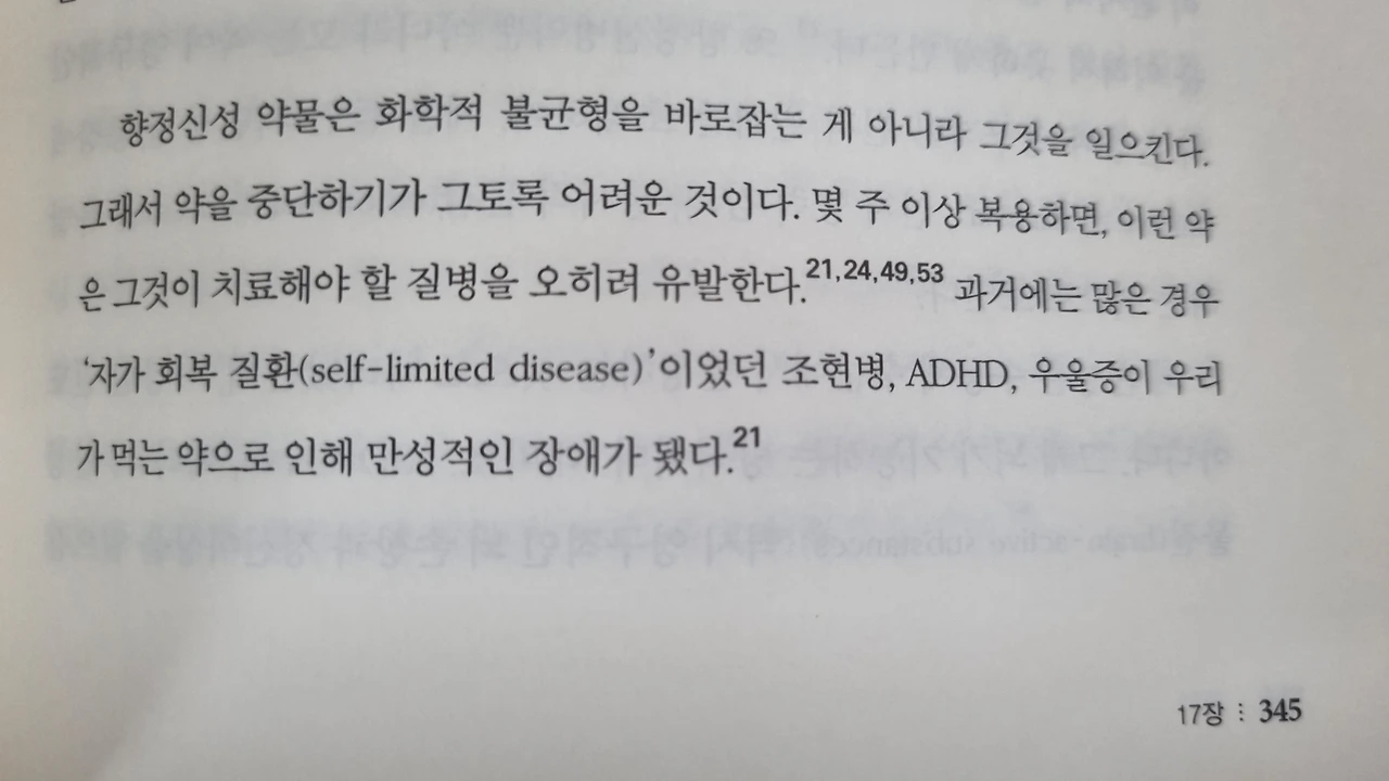 향정신성 약물은 화학적 불균형을 바로잡는 게 아니라 불균형을 더 일으킨다. 그래서 약을 중단하기가 그토록 어려운 것이다(한번 시작하면 끊기가 매우 힘듦) 몇 주 이상 복용하면, 이런 약은 정신을 치료하는 게 아니라 오히려 더 심해지게 한다. 과거에는 조현병, ADHD, 우울증이 자가 회복 질환이었다. (가만히 두면 자연회복됨 ) 하지만 이젠 약물로 인해 만성적인 장애가 되었다.