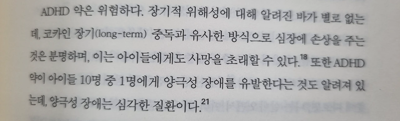 ADHD약은 위험하다. 코카인 장기 중독과 유사한 방식으로 심장에 손상을 주는 것이 분명하며, 이는 아이들에게도 사망을 초래할 수 있다. 또는 ADHD약이 아이들 10명 중 1명에게 양극성 장애를 유발한다는 것도 알려져 있다.
