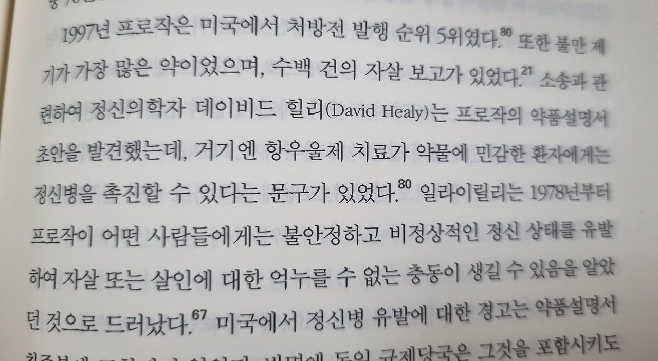 책(위험한 제약회사)에는 우울증 약의 부작용으로 자살하는 사람들이 무수하다고 한다. 없어져야 할 약이지만 항우울제는 현재 세계판매 1위다. 혼자만 죽는 게 아니다. 타인까지 죽인다.