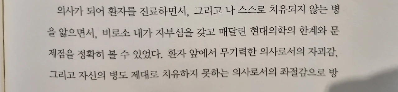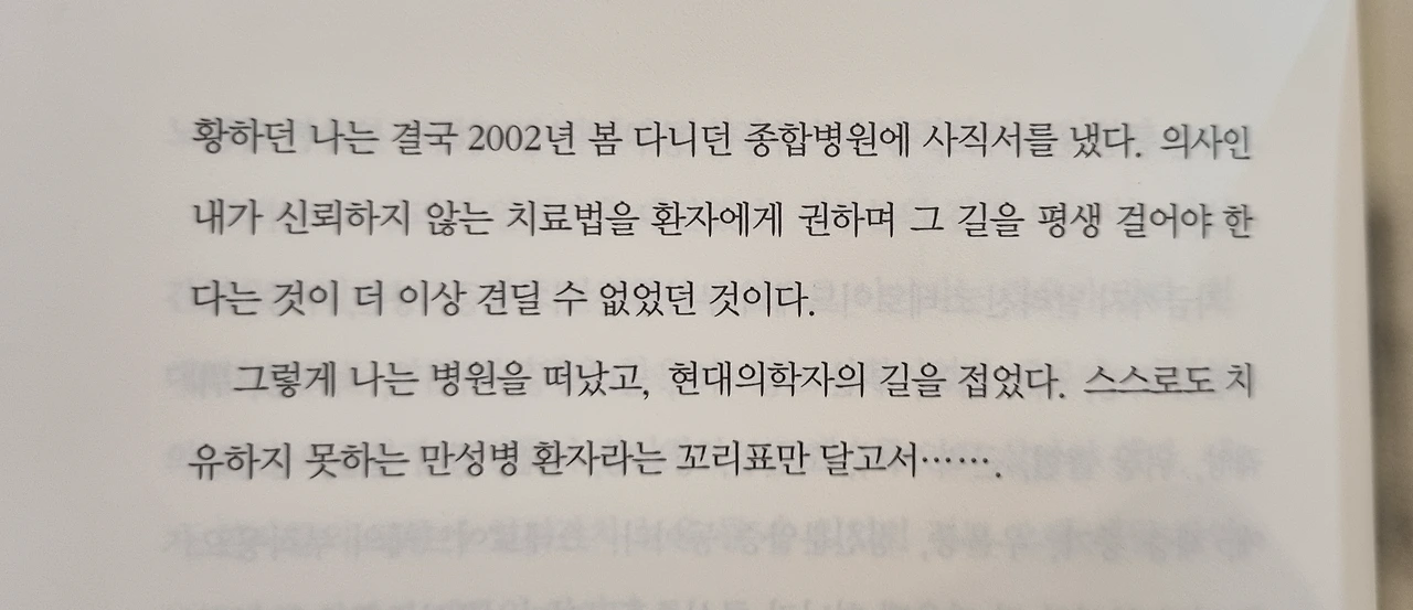 환자 앞에서 무기력한 의사로서의 자괴감, 그리고 자신의 병도 제대로 치유하지 못하는 의사로서의 좌절감으로 방황하던 나는 결국 2002년 봄 다니던 종합병원에 사직서를 냈다. 의사인 내가 신뢰하지 않는 치료법을 환자에게 권하며 그 길을 평생 걸어야 한다는 것이 더 이상 견딜 수 없었던 것이다. 그렇게 나는 병원을 떠났고, 현대의학자의 길을 접었다. 스스로도 치유하지 못하는 만성병 환자라는 꼬리표만 달고서...