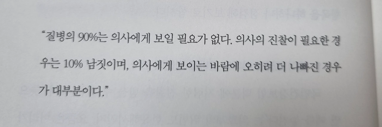 질병의 90%는 의사에게 보일 필요가 없다. 의사의 진찰이 필요한 경우는 10% 남짓이며, 의사에게 보이는 바람에 오히려 더 나빠진 경우가 대부분이다.
