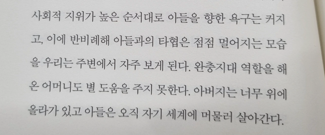 사회적 지위가 높은 순서대로 아들을 향한 욕구는 커지고 이에 반비례해 아들과의 타협은 점점 멀어지는 모습을 자주 본다. 아버지는 너무 위에 올라가 있고 아들은 오직 자기 세계에 머물러 살아간다.