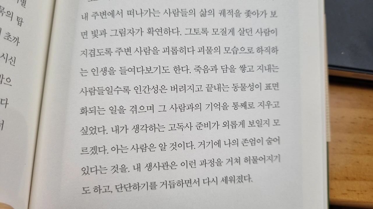 내 주변에 떠나가는 사람들의 삶의 궤적을 따라가 보면 빛과 그림자가 확연하다. 그토록 모질게 살던 사람이 지겹도록 주변 사람을 괴롭히다 괴물의 모습으로 하직하는 인생을 들여다보기도 한다. 죽음과 담을 쌓고 지내는 사람들일수록 인간성을 버려지고 끝내는 동물성이 표면화되는 일을 겪으며 그 사람과의 기억을 통째로 지우고 싶었다. 내가 생각하는 고독사 준비가 외롭게 보일지 모르겠다. 아는 사람은 알 것이다. 거기에 나의 존엄이 숨어 있다는 것을. 내 생사관은 이런 과정을 거쳐 허물어지도 하고, 단단하기를 거듭하면서 다시 세워졌다.